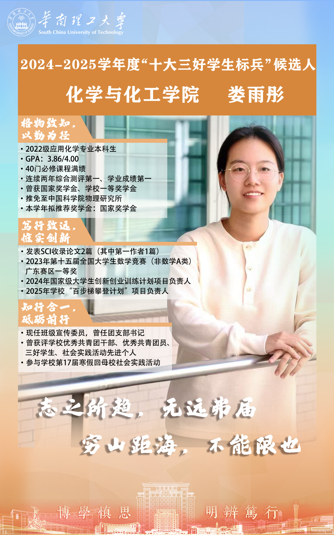 2025年11月20日晚,华南理工大学2024-2025年度“十大三好学生标兵”评选活动决赛在清清文理楼108报告厅举行。我院2022级应用化学专业本科生娄雨彤同学经学院推荐、学校评议等环节晋级决赛,并最终凭借扎实的专业基础、出色的科研经历以及丰富的社会实践,荣获“十大三好学生标兵“荣誉称号。