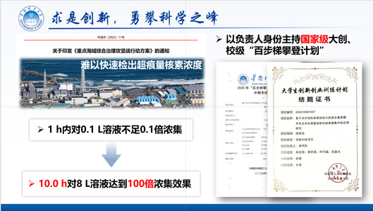 娄雨彤同学响应学校的号召,以成为“创新型人才”为目标,她以负责人身份主持国家级大创、校级“百步梯攀登计划”,深耕解决超痕量放射性核素难以快速检出的难题,研究成果实现了从1h内对0.1L溶液不足0.1倍浓集到10h内对8L溶液的百倍浓集的出色效果。依托项目研究,她参与发表了一篇化工领域Top级期刊,并以第一作者身份发表了一篇SCI论文,用实际行动诠释“将论文写在祖国大地上”的初心。