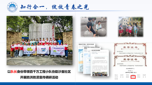 作为团干,她精心策划多次团日活动,引领同学们坚定理想信念、凝聚集体力量;她曾作为队长带领小队协助社区开展“汛期巡河不停歇,筑牢防汛安全网”活动,带领中小学志愿者巡河护河、普及防洪知识、开展问卷调查。