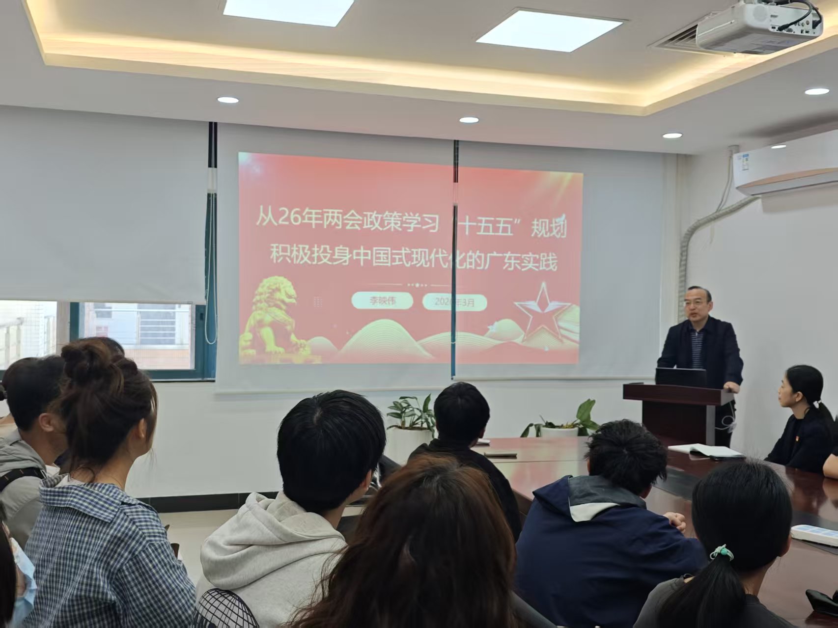 李映伟院长在授课中强调,学生党员要充分发挥先锋模范作用,把“十五五”规划部署、两会精神与总书记对广东的重要指示精神紧密结合,立足化学化工专业特色,把理论学习成果转化为干事创业、科研攻坚、服务地方的实际行动,主动投身广东高质量发展大潮,以实际行动助力中国式现代化的广东实践落地见效。