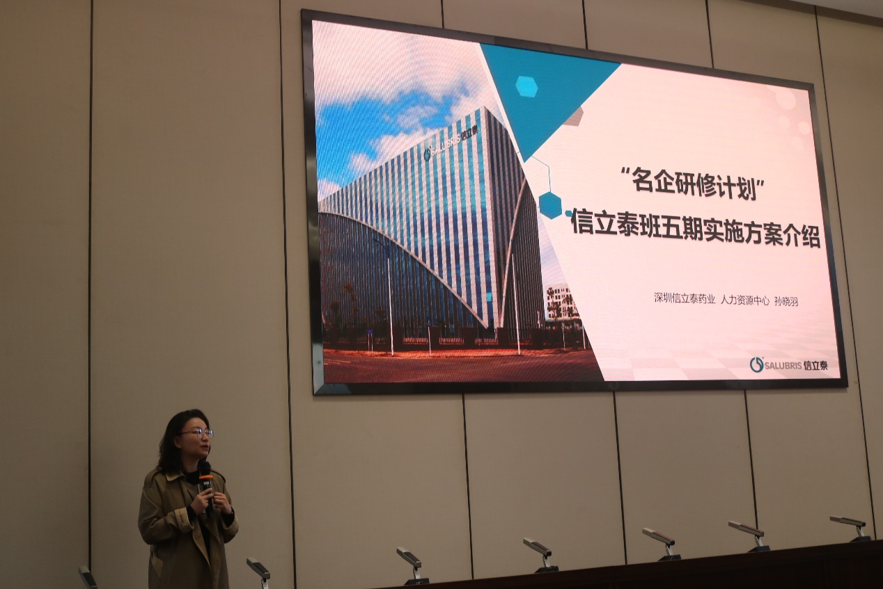 人力资源中心孙晓羽总监为学员们介绍信立泰班第五期项目方案,介绍了“信立泰班”的背景,展示了学员的构成,奖学金设置,通过信立泰班第四期见习活动的精彩剪影,详细讲解了研修计划的学习模块:以需求为出发点的专业讲座设置,让学员们更为系统的了解从药物发现到上市销售的全流程及对应岗位介绍,进而系统思考职业规划与发展。创业实践课设置了从感知企业文化到全场景见习,从专家交流到活动竞赛等各种精心设计的教学环节,激发学员们的兴趣。最后,孙总希望学员们能够通过信立泰班深入地了解专业知识在实际工作中的应用,进而开拓职业发展的视野,为未来的职业生涯打下坚实的基础。