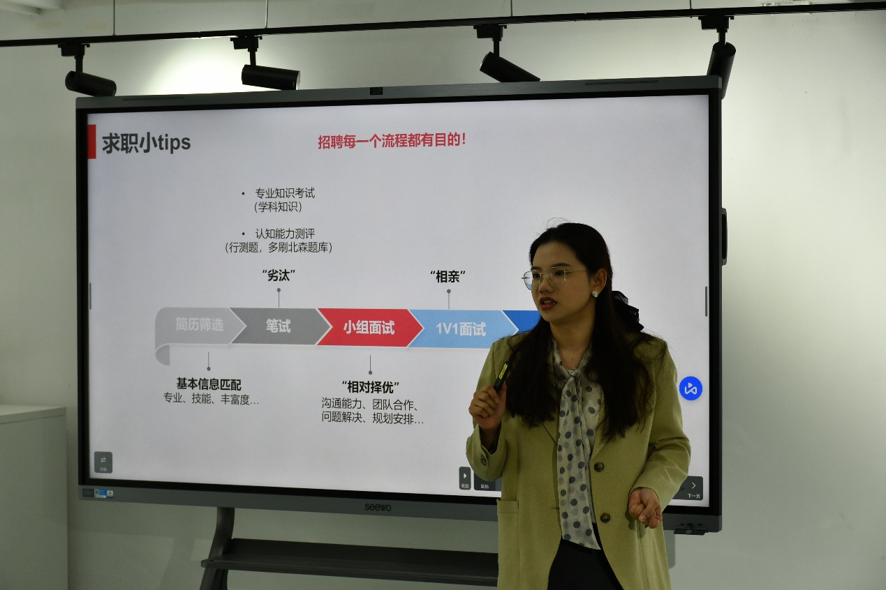 培训会上,李玉连给学生分享了“STAR法则”等简历撰写实用方法和“企业背调”等面试经验。通过此次分享会,同学们清晰认识到了简历撰写和面试准备的重要性,掌握了相关的简历制作方法和面试技巧,更加明晰了未来的职业发展规划。