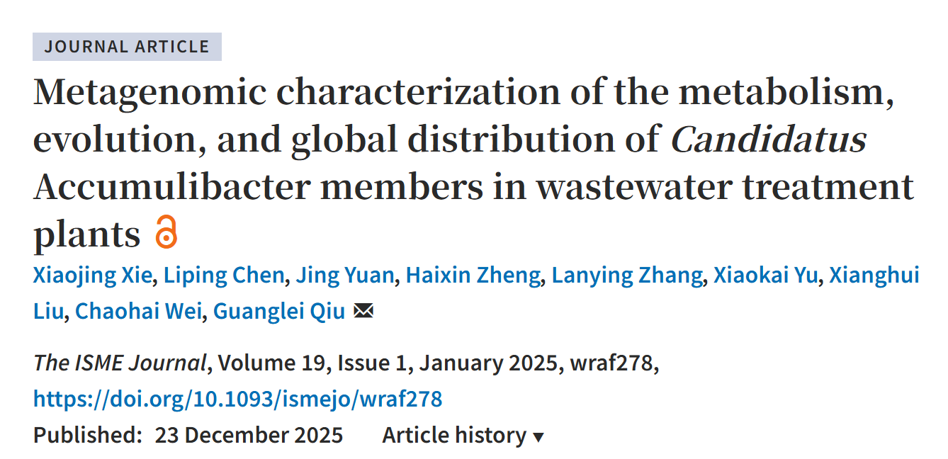 2025年12月23日,国际微生物生态学权威期刊《The ISME Journal》在线发表了学院邱光磊教授团队题为《Metagenomic characterization of the metabolism, evolution, and global distribution of Candidatus Accumulibacter members in wastewater treatment plants》的研究成果。