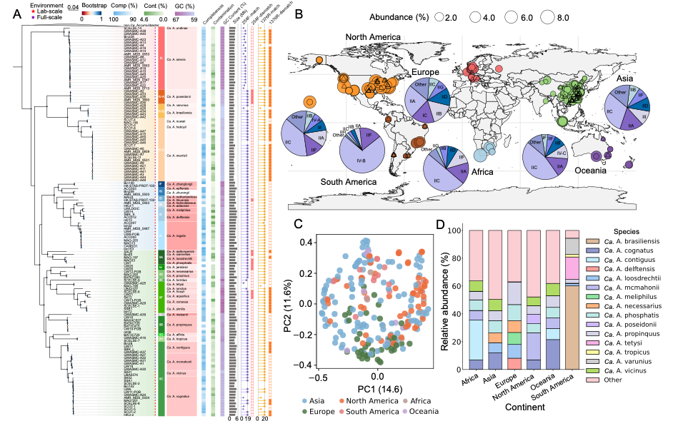 图1. Candidatus Accumulibacter的系统发育基因组学与全球生物地理分布