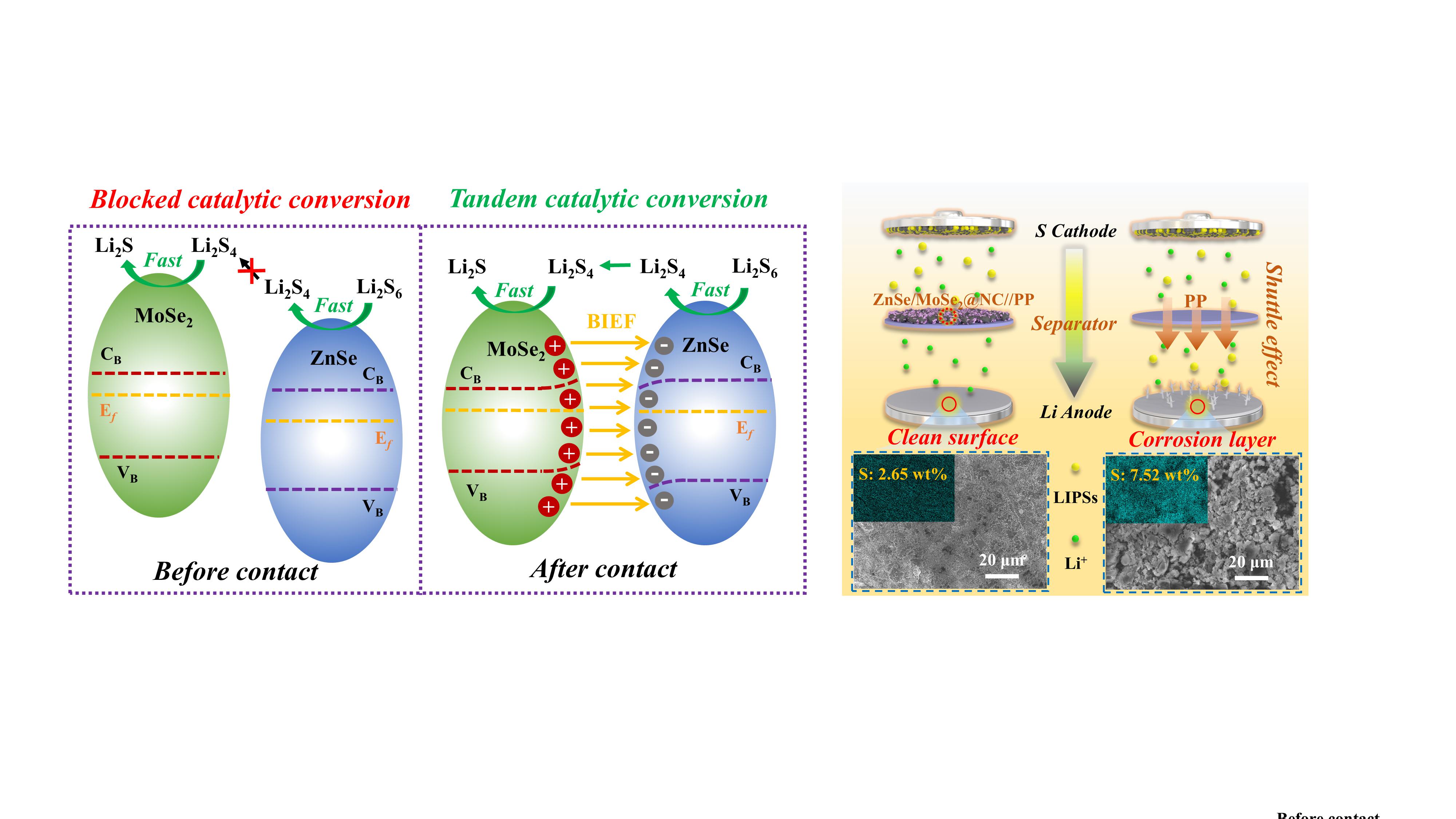 标题:氮掺杂空心碳纳米笼中ZnSe-MoSe2异质结的阶梯式调控策略助力锂硫电池多硫化物高效转化 第一作者:李红喜 通讯作者:李雪辉,袁文辉 通讯单位:华南理工大学化学与化工学院;华南理工大学珠海现代产业创新研究院 关键词:锂硫电池;穿梭效应;异质修饰剂;内建电场;分步催化 DOI号:10.1016/j.apcatb.2025.125631 全文概述: 锂硫电池(LSBs)因其高达1675 mAh g<span style="font-family:"times new roman";">-1的理论比容量和硫的低成本特性,被视为下一代高能量密度储能技术的潜力候选者。然而,可溶性多硫化物(Li2Sn, 4 < n ≤ 8)的“穿梭效应”和缓慢的转化动力学,严重阻碍了其实际应用。传统单功能催化剂如同“单腿走路”,难以兼顾多硫化物转化链中不同阶段的差异化需求——既要强力锚定长链多硫化物,又需高效催化绝缘态Li2S的沉积/解离。更棘手的是,多硫化物中间体(如S42-)在活性位点的堆积会阻塞催化界面,形成“交通拥堵”。针对这一难题,创新性地提出了“异质结阶梯式催化”策略,设计出ZnSe/MoSe2@NC复合隔膜修饰材料。该工作通过“预组装-硒化”两步法,将ZnSe-MoSe2异质结精准嵌入氮掺杂空心碳纳米笼(NC)中,构建了多界面协同的催化体系。密度泛函理论(DFT)计算揭示,ZnSe通过削弱Li-S/S-S键能(2.21 Å→2.41 Å)显著降低长链多硫化物转化能垒(-0.01 eV),而具有二维层状结构的MoSe2的则充当“双向收费站”,既保证了Li+快速迁移,又促进惰性产物Li2S的成核与分解。更有趣的是,异质界面处的内置电场(BIEF)如同“高速公路”,驱动多硫化物中间体从ZnSe向MoSe2定向迁移,解决了传统异质催化剂活性位点“堵塞”的痛点。