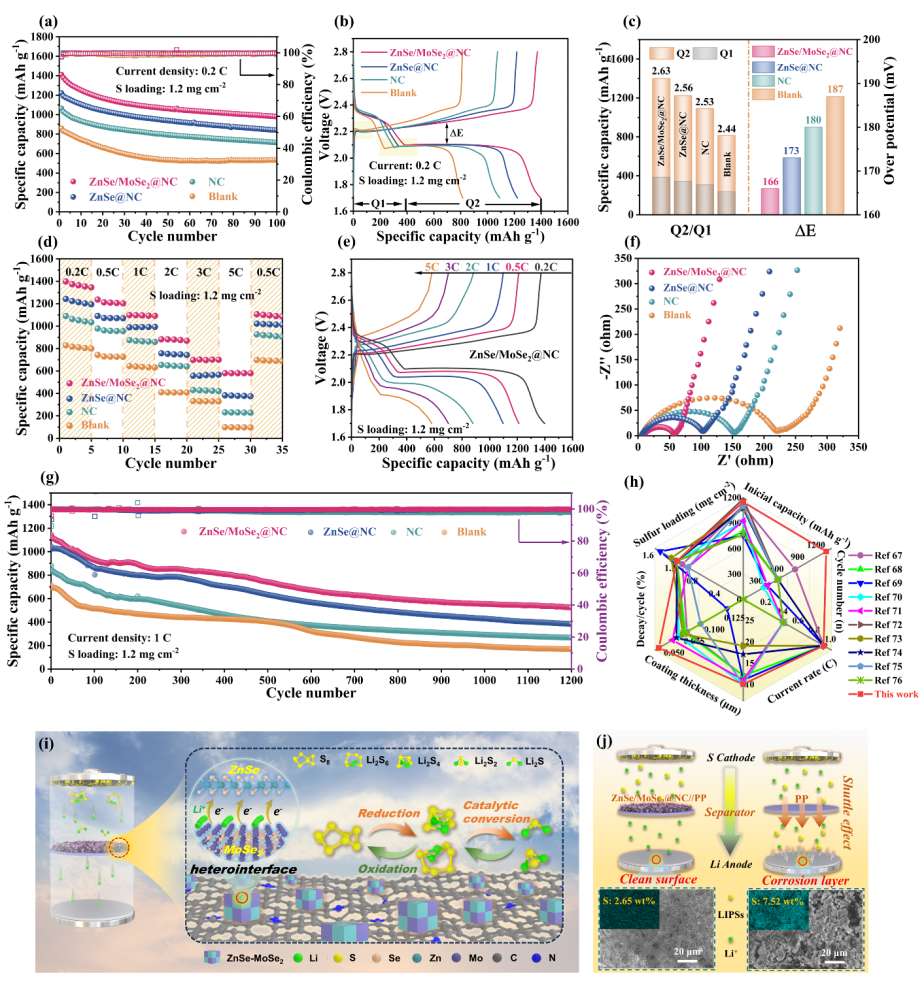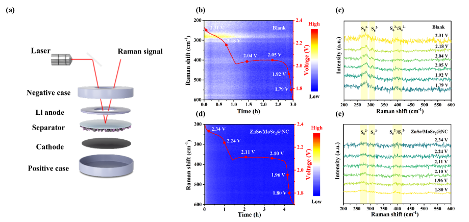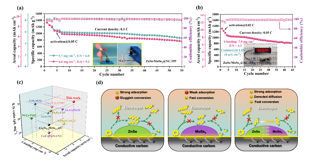 Fig. 4. a) Schematic diagram of in situ Raman test principle. b,d) In situ time-resolved Raman spectra of the PP and ZnSe/MoSe2@NC//PP cells. c,e) Selected in situ Raman spectroscopy of the PP and ZnSe/MoSe2@NC//PP cells. 要点三: 得益于ZnSe/MoSe₂@NC异质结构的协同催化机制,多硫化物的“穿梭效应”得到有效抑制,整体硫氧化还原动力学显著提升。改性隔膜组装的锂硫电池展现了出色的放电容量(0.2 C倍率下1411 mAh g-1)、卓越的倍率性能(5.0 C倍率下580 mAh g-1)以及稳定的循环寿命(1.0 C倍率下循环1200次,平均圈容量衰减率仅为0.045%)。即使在高硫载量(7.9 mg cm-2)且稀电解液(E/S比值约为4.3)的极端工况下,该电池仍展现出8.6 mAh cm-2的杰出面容量,远高于商业锂离子电池(约4.0 mAh cm-2),表明ZnSe/MoSe₂@NC异质修饰材料的设计开发具备较大的应用潜力和商业前景。