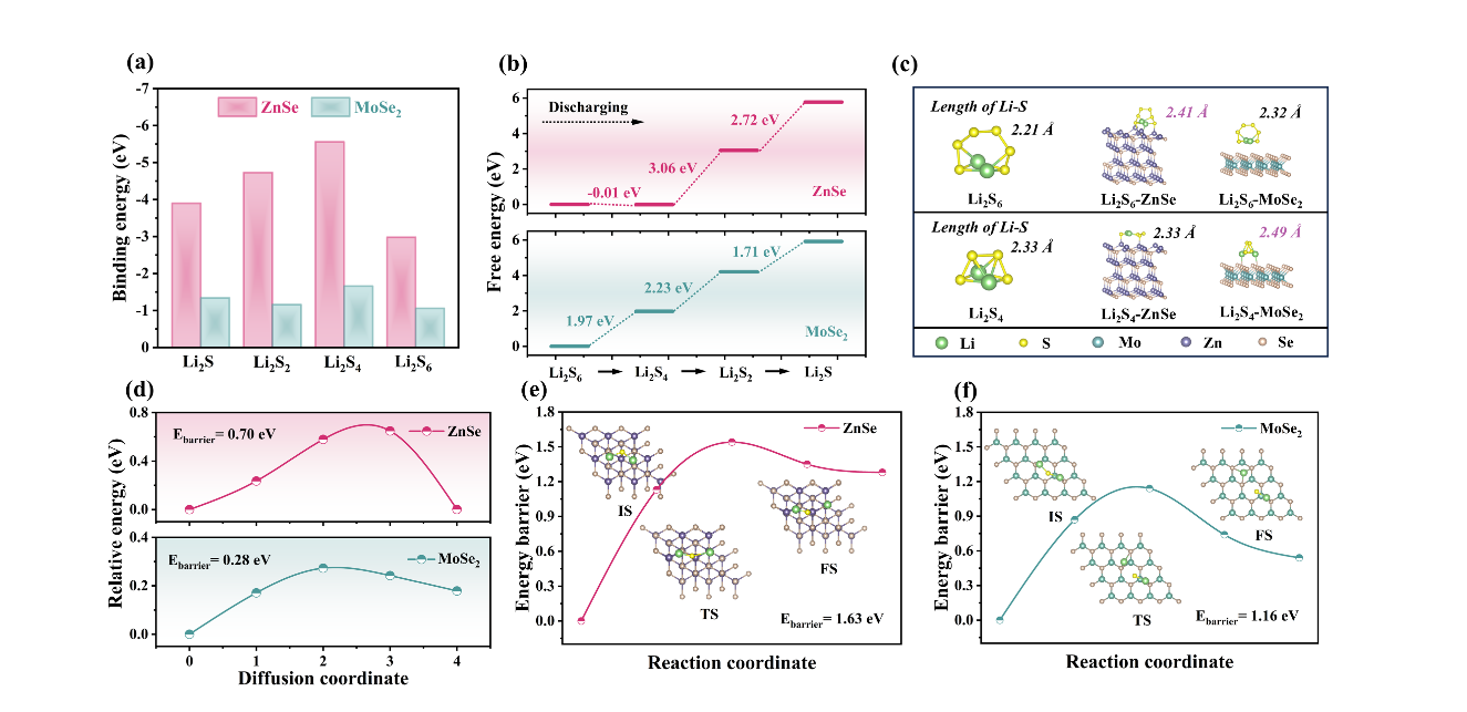 Fig. 3. a) Binding energies of Li2Sn (n = 1, 2, 4, 6), b) Free energy evolution for the Li2S6 reduction, c) The Li-S bridged bond lengths of Li2S6 and Li2S4, d) Diffusion barriers of Li+, and e,f) Decomposition of Li2S cluster on ZnSe (111) and MoSe2 (002) surfaces (insets: the corresponding decomposition models from initial state to transient state, and finally to final state).