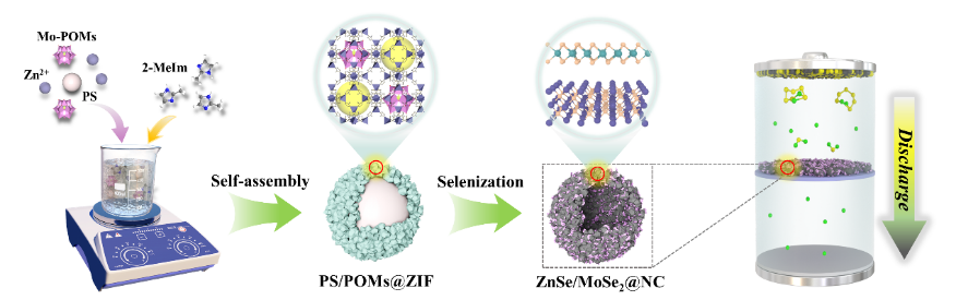 要点一: 通过简便的“预组装-硒化”两步法合成了ZnSe/MoSe₂@NC异质结构。在制备前驱体时,采用了MOFs辅助策略(预分散与固定策略),通过原位合成ZIF-8将Mo-POMs封装入分子笼中,形成POMs@ZIF壳层。这些非配位Mo-POMs在沸石咪唑环框架(ZIF)中均匀单分散并原子级固定,该框架作为制备多界面ZnSe/MoSe₂异质结的理想预组装平台。此外,采用PS作为自牺牲模板,赋予了最终产物空心纳米结构。三维纳米笼形态有效促进了催化活性位点的暴露,有利于LIPSs的吸附/催化。 传统异质结构主要通过水热法和气相沉积法制备,多数方法涉及高温和多步反应条件。且过渡金属硒化物在高温合成过程中倾向于单独成核。目前报道的硒基异质催化剂仍缺乏确保高性能锂硫电池所需的活性位点数量。该工作提出了一种可控的合成方法,为制备具有完全融合相和高度暴露异质界面的过渡金属硒化物(TMSe)基异质催化剂提供了参考。