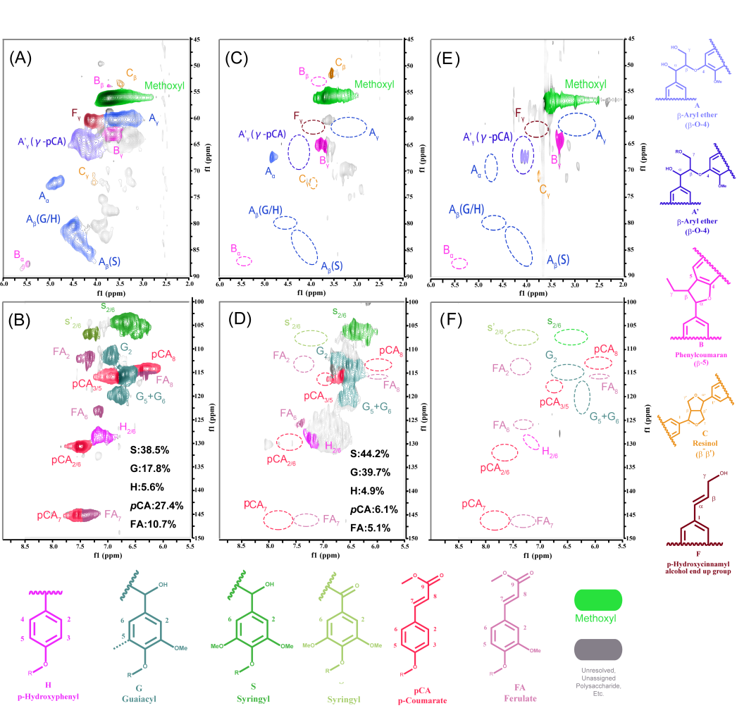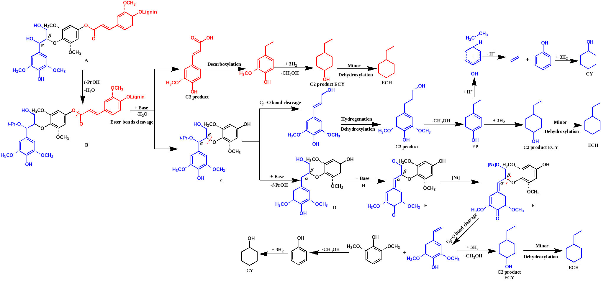 图4 蔗渣木质素反应前后的2D HSQC NMR图谱 此外,还采用2D HSQC NMR、FT-IR等技术对Cu6Ni20/MgCr1Ox催化体系中木质素加氢脱氧过程中的结构演变规律进行研究(图4),并结合文献报道,提出了可能的反应路径(图5)。该机理以β-O-4结构为核心,突出Cr调控Ni0活性中心、MgCr2O4调节酸碱性、以及异丙醇诱导的α-OH酯化过程协同驱动Cα-O、Cβ-O、Cβ-Cγ等多重键裂解,最终实现芳基侧链深度脱氧生成C2(4-乙基环己醇、4-乙基环己烷等)和C3(pCA等)碎片产物。机理中指出,Cr不仅提高了Ni表面的还原性和脱氧能力,还通过稳定中间体(如醌亚甲基)促进关键C–O键的断裂;同时,碱性环境有助于γ-OH脱质子生成负氧物种,提升了Cγ-Cβ/Cβ–H断裂速率,进一步强化了C2产物的形成过程。