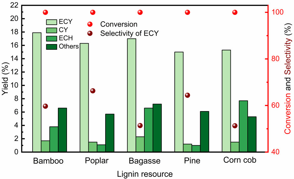 全文链接:https://aiche.onlinelibrary.wiley.com/doi/10.1002/aic.18903 文献速读: 4-乙基环己醇是聚合物工业中重要的石油中间体,然而,目前的工业合成路线高度依赖多步石化流程,能耗大、环境负担重。本文创新性地利用丰富的可再生竹木木质素为原料,构建Cu-Ni/MgCrOx尖晶石催化体系,实现了其高效定向解聚为4-乙基环己醇(17.9 wt.%的收率和59.5%的选择性)。通过精准调控催化剂中Ni⁰与Cu⁺的协同效应及MgO与MgCr2O4的酸碱性能,实现了Cβ–O键断裂、去甲氧基化和饱和加氢在内的串联反应。该成果不仅为木质素的高值化利用提供了新路径,更为替代石化原料打开了突破口,展示了生物质化工走向可持续未来的强劲动力。 正文导读: 作为地球上储量最丰富的可再生芳香族资源,木质素被视为取代石油化学品的重要潜力原料。然而,其结构复杂、键能高(如C-O和C-C键),导致高效选择性转化一直面临巨大挑战。4-乙基环己醇广泛用于塑料、尼龙、医药等领域的高值中间体,目前仍主要依赖石油途径多步合成,不仅能耗高、成本大,还加剧了对不可再生资源的依赖。 本研究创新性地构建了Cu-Ni/MgCrOx尖晶石催化体系,对木质素中的Cβ-O键进行定向解聚为4-乙基环己醇,并对催化剂的结构与性能之间的构效关系,催化反应机理和目标产物4-乙基环己醇的生成路径进行探究。系统考察了不同催化体系中含H、G、S三种结构单元的甘蔗渣木质素的加氢脱氧(HDO)性能。研究发现,未加催化剂时虽有较高转化率(80.2%),但单体产率极低(2.3%),说明产物以难挥发低值寡聚酚为主,揭示出木质素高选择性转化的关键瓶颈。为了实现对产物分布的精准调控,研究进一步引入Mg-M-O复合氧化物载体(M = Ca、Mn、Al、Zr、Zn、Cr)。结果表明,Cu6Ni20/MgCrOx催化剂在各体系中表现最优:木质素转化率高达94.2%,且其挥发性产物主要由4-乙基环己醇(11.5%)、4-乙基环己烷(3.7%)和环己烷(1.1%)组成。通过调控Cr、Cu和Ni的负载量,可进一步将4-乙基环己醇的收率提升至13.8%以上。此外,该Cu6Ni20/MgCrOx催化体系还展现了优异的底物适应性,可实现多种来源(草本、阔叶木、针叶木)的木质素高效加氢脱氧制备4-乙基环己醇(图1)。尤其是,当以竹木质素为原料时,单环类产物收率达30.1 wt.%,其中4-乙基环己醇的选择性为59.5%(收率为17.9%),接近理论最大值的65.7%与53.4%。