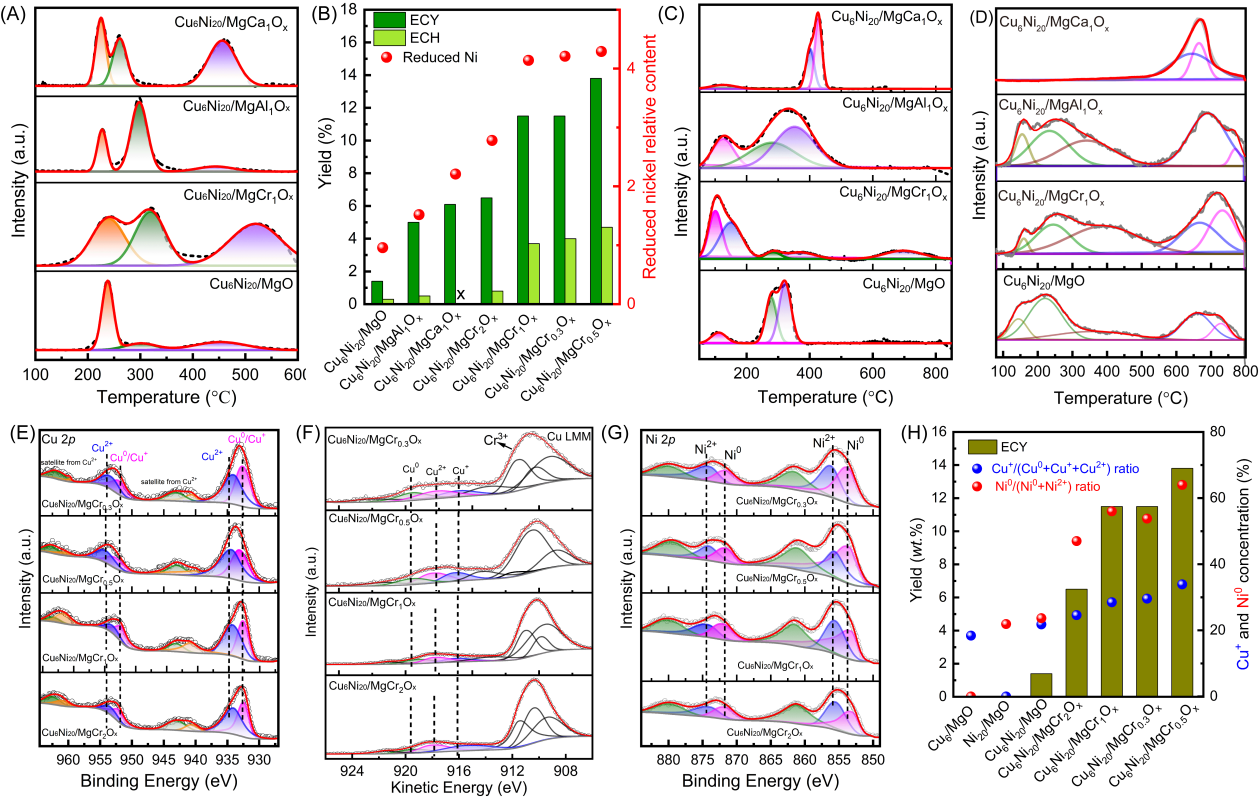 图3 (A) H2-TPR图谱. (B) 产物收率与催化剂中Ni0物种的关系. Cu-Ni/Mg-Cr-O催化剂的(C) CO2-TPD. (D) NH3-TPD. (E) Cu 2p. (F) Cu LMM. (G) Ni 2p的XPS图谱. (H)催化活性与Cu+/(Cu0+Cu++Cu2+), Ni0/(Ni0+Ni2+)物种含量之间的关系. 本文进一步系统分析了其还原性能、酸碱特性及表面电子结构(图3)。H2-TPR结果(图3A)显示,Cr的引入促使NiO向表面迁移并还原为活性Ni0。这归因于Cr2O3与MgO形成尖晶石结构MgCr2O4,削弱了NiO与MgO的强相互作用,抑制了难还原的NiMgOx的生成。该结构重构同时提高了Ni物种的表面分散度和还原性,显著增强了木质素加氢脱氧能力。CO2/NH3-TPD测试(图3C-D)揭示,Cu6Ni20/MgCr1Ox表现出丰富的强碱性位(>600°C)与中强酸位(300-700°C),前者有助于抑制苯酚缩合,后者促进芳环饱和氢化,提高4-乙基环己醇(ECY)选择性。XPS与Auger谱图(图3E-G)进一步证实其表面Cu⁺和Ni⁰含量分别高达33.9%和64.0%,且与产物收率呈正相关(图3H),Cu⁺与Ni⁰协同作用是提升催化性能的关键因素。此外,还原Ni含量与4-乙基环己醇产率呈明显正相关(图3B),Cu6Ni20/MgCr0.5Ox表现出最高的Ni0含量(4.29),和产物收率(13.8%),进一步证明Ni0是木质素裂解和芳环加氢的主要活性中心。