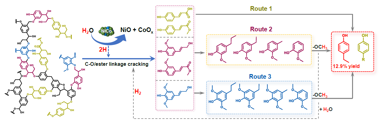Scheme 2 Plausible pathway of the hydrogenolysis of lignin to 4-ethyl phenol 木质素转化为4-乙基苯酚的反应历程:路线1为pCA单元可通过脱羧反应转化为4-乙基苯酚;路线2则是FA经过脱羧反应生成4-乙基愈创木酚,进一步脱甲氧基化生成4-乙基苯酚;在路线3中,裂解木质素中的C-O键得到的S单元产物经过脱甲氧基化生成4-乙基苯酚。 小结 这项工作报道了一种新型“无氢”催化木质素氢解策略,即无外加氢气下,Ni-Co双金属化学裂解水引发木质素氢解反应过程。在最佳反应条件下(0.15 g催化剂,0.1 g木质素,15 mL H2O,1.0 MPa Ar,270 ℃,反应4 h),木质素的转化率为83.8%,单酚和H单元收率分别为20.8和16.5%,4-乙基苯酚的收率为12.9%。木质素氢解过程的初始氢物种源于纳米Ni-Co合金活性位点和H2O形成的不可逆-氧化还原体系,以诱导木质素中特征化学键的断裂。该工作为非贵金属催化木质素“无氢”解聚提供了新的研究思路。 文章链接 https://www.sciencedirect.com/science/article/pii/S0926337325010264 致 谢 衷心感谢国家自然科学基金,广东省国际合作项目,以及广州市科技计划的资助。 |