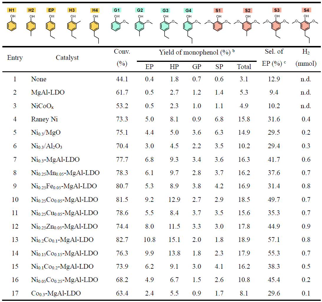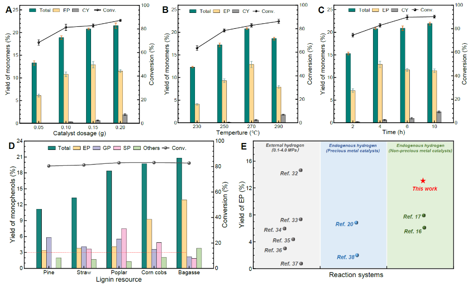 a Reaction conditions: 0.1 g lignin, 0.1 g catalyst, 15 mL H2O, 1.0 MPa Ar, 270 ℃, 4 h. b4-ethylphenol is denoted as EP. HP, GP and SP represented the monophenols originated from the H-lignin, G-lignin and S-lignin, respectively. c Selectivity of 4-ethylphenol is abbreviated as Sel. of EP. 条件优化