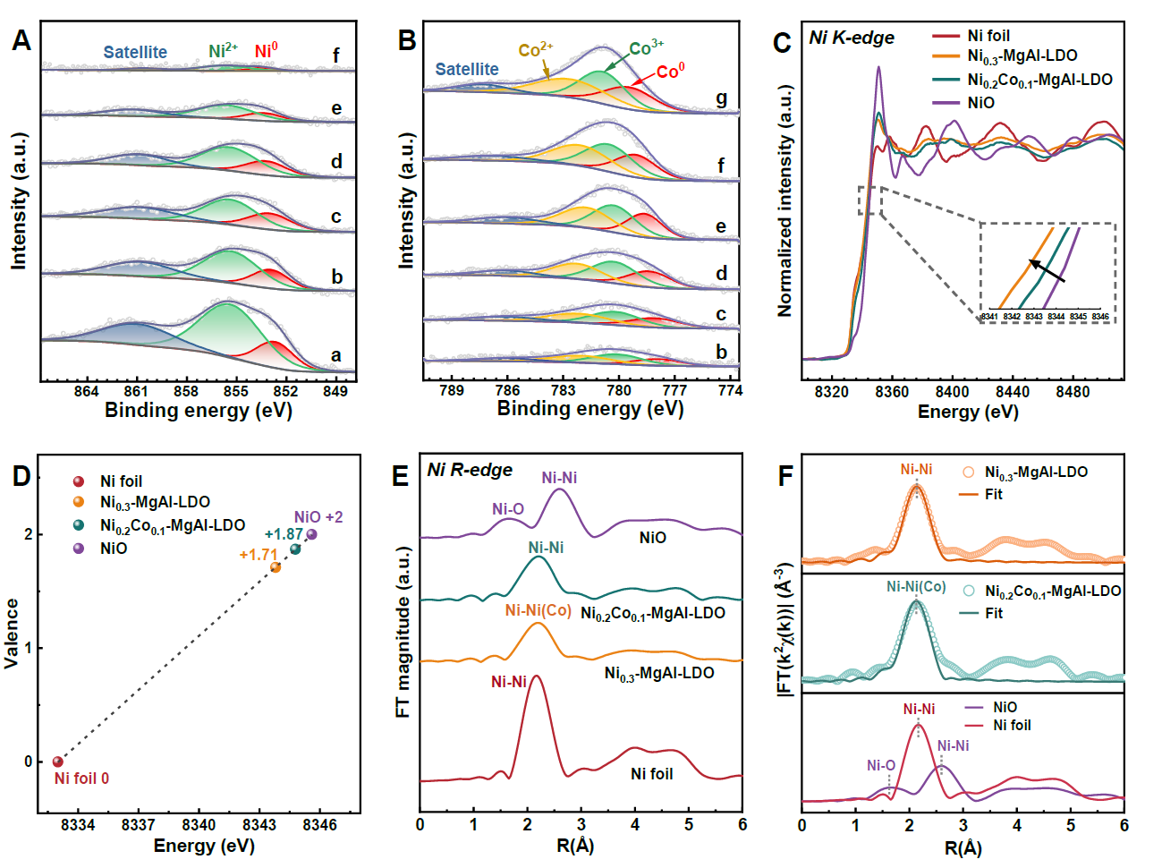 Figure 3. XPS spectra for (A) Ni 2p3/2 and (B) Co 2p3/2 of (a) Ni0.3-MgAl-LDO, (b) Ni0.25Co0.05-MgAl-LDO, (c) Ni0.2Co0.1-MgAl-LDO, (d) Ni0.15Co0.15-MgAl-LDO, (e) Ni0.1Co0.2-MgAl-LDO, (f) Ni0.05Co0.25-MgAl-LDO and (g) Co0.3-MgAl-LDO; (C) Normalized Ni K-edge XANES spectra, (D) fitted valence states and (E) FT-EXAFS spectra of Ni foil, NiO,Ni0.3-MgAl-LDO and Ni0.2Co0.1-MgAl-LDO and (F) the corresponding EXAFS fitting curve in R space. 纳米薄片组成的花状Ni0.2Co0.1-MgAl-LDO催化剂具有多级孔结构,其较薄的纳米片层能够促进木质素大分子的传质;较宽的孔径分布能够有效增加催化剂和木质素的兼容性。不同NiCo摩尔比的催化剂呈现出显著的活性差异,Ni0.2Co0.1-MgAl-LDOs催化木质素转化获得的4-乙基苯酚收率为12.9%,其原因在于Co元素的引入能够调节MgAl-LDOs载体表面强碱性位点,并且促进Ni与Co之间的电子转移,进一步提高其脱甲氧基化能力,从而影响了其催化活性及主产物的选择性。 氢源探究