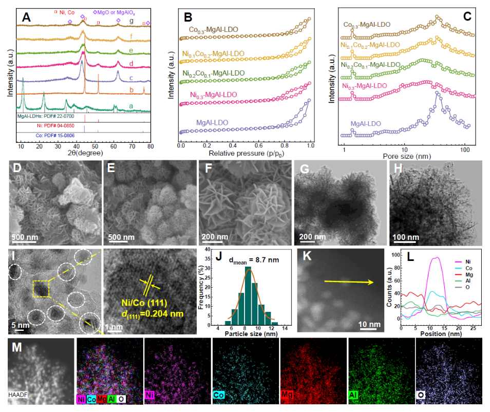 Figure 2. (A) XRD patterns of (a) Ni0.2Co0.1-MgAl-LDHs, (b) NiCoOx, (c) MgAl-LDO, (d) Ni0.3-MgAl-LDO, (e) Ni0.2Co0.1-MgAl-LDO, (f) Ni0.1Co0.2-MgAl-LDO and (g) Co0.3-MgAl-LDO. (B) N2 adsorption-desorption isotherms and (C) corresponding BJH pore size distributions. (D) SEM image of Ni0.2Co0.1-MgAl-LDHs. (E, F) SEM and (G, H) TEM images,(I) HRTEM image, (J) particle size distribution of Ni NPs, (K) HAADF-STEM image, (L) line scan profiles of Ni, Co, Mg, Al and O elemental distribution and (M) HAADF-STEM image with the corresponding element mappings for Ni0.2Co0.1-MgAl-LDO.