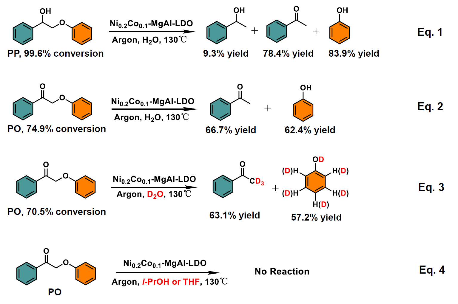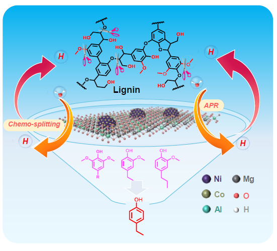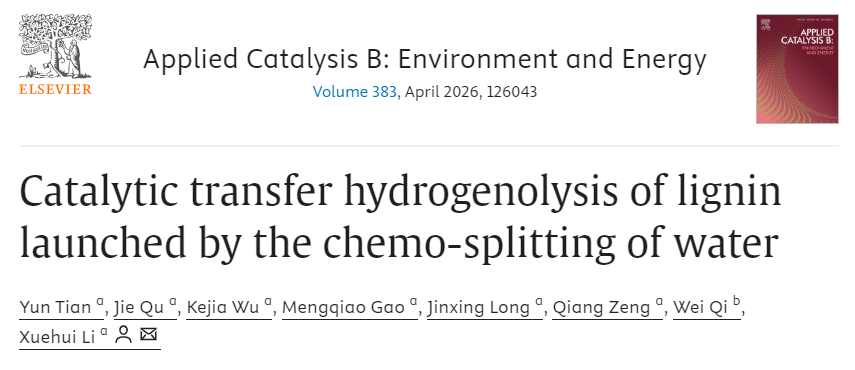 成果简介 近日,本课题组田运博士在Applied Catalysis B: Environment and Energy上发表了题为“Catalytic Transfer Hydrogenolysis of Lignin Launched by the Chemo-Splitting of Water”的研究论文(DOI: 10.1016/j.apcatb.2025.126043)。提出了一种新型“无氢”催化木质素氢解策略,即无外加氢气下,在Ni-Co双金属催化剂上通过水的化学裂解引发木质素氢解反应过程。研究证实,化学裂解水触发木质素氢解反应,并通过串联脱甲氧基化及其水相重整反应进一步促进木质素中特征化学键的裂解。本研究为催化木质素“无氢”解聚提供了新颖的研究思路。 全文速览 目前,催化木质素氢解中常用的氢供体包括低碳醇、甲酸或木质素自身基团(CαH-OH、CγH2-OH和-OCH3基团)。然而,水作为最重要的氢资源之一,也常用作一种廉价、无毒、环保的反应介质,却很少被作为催化木质素解聚的氢源。此前,以水为氢源的研究主要集中在生物基平台化合物的增值过程。因此,进一步开发以水为氢源的催化木质素氢解体系具有重要的意义。本工作设计了一种新型催化木质素氢解策略,即以纯水为溶剂和初始氢源,在NiCo双金属催化剂作用下高选择性催化木质素转化制备单酚。通过筛选金属种类、调控Ni/Co摩尔比获得最佳催化剂Ni0.2Co0.1-MgAl-LDOs。考察了反应条件对催化活性的影响,并采用XPS和XAFS等系列表征技术研究了催化剂的构效关系。通过元素分析、FT-IR和2D HSQC NMR等表征手段及氘代示踪实验,并以模型化合物为探针分子和DFT计算深入探究了催化过程与断键机理。该研究为催化木质素“无氢”解聚新体系的开发提供了重要参考。 引言 通常木质素氢解需在高温和高压氢气压力下激活H2分子,这导致操作过程存在安全问题。同时,在高压氢气条件下,芳香单体产物易加氢使其丢失芳香性。目前,有关木质素自供氢解聚的研究进展主要是利用贵金属(Pd,Pt和Ru)催化剂。然而,对这些贵金属的开采和提纯将产生大量废料,使得温室气体排放急剧增加。一些非贵金属或富量金属同样是催化木质素中C-O/C-C键断裂的优良催化剂。但在低压氢气条件下,非贵金属催化剂的氢解能力相对较低。因此,设计制备新型非贵金属催化剂,需既保证催化剂的氢解能力,同时减少单酚产物过度加氢反应。本工作设计了固体碱协同纳米Ni-Co双金属化学裂解水催化木质素氢解策略。 图文导读 催化活性 Table 1.Lignin depolymerization in different catalytic systems a
