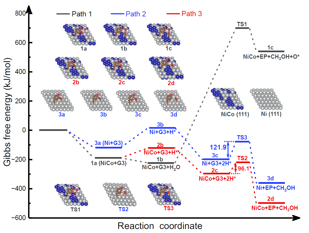 Figure 5.The potential energy diagrams for the demethoxylation of 4-ethylguaiacol (G3) via different pathway on NiCo (111) and Ni (111) sites.