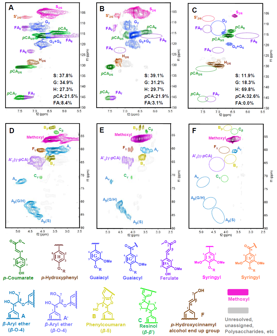 Figure 4. 2D-HSQC NMR spectra of (A, D) raw lignin, (B, E) Re-lignin-THF and (C, F) Re-lignin-H2O. 木质素氢解过程的初始氢物种源于纳米Ni-Co合金活性位点和H2O形成的不可逆-氧化还原体系,以诱导木质素中特征化学键的断裂。木质素解聚过程包括裂解水生成氢物种,断裂β-O-4、β-5键,G/S单元的脱甲氧基化及其APR原位制氢。