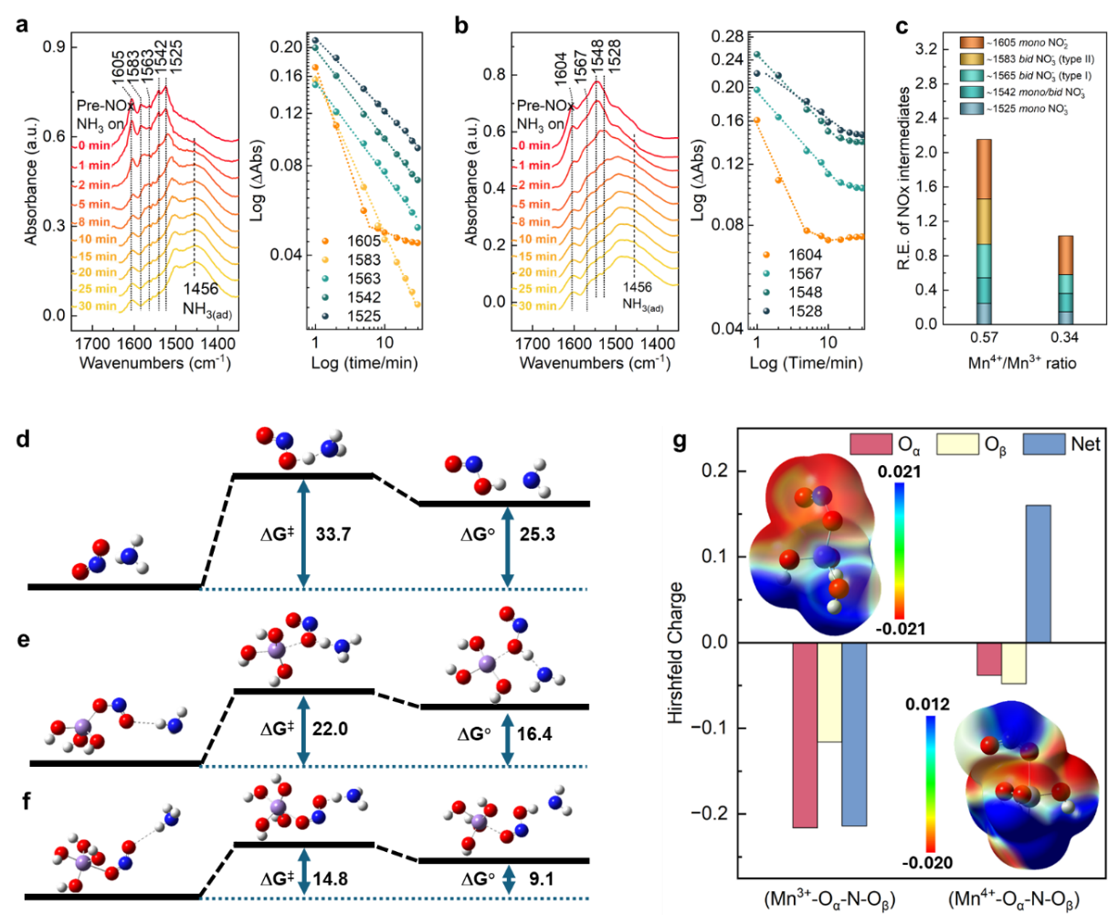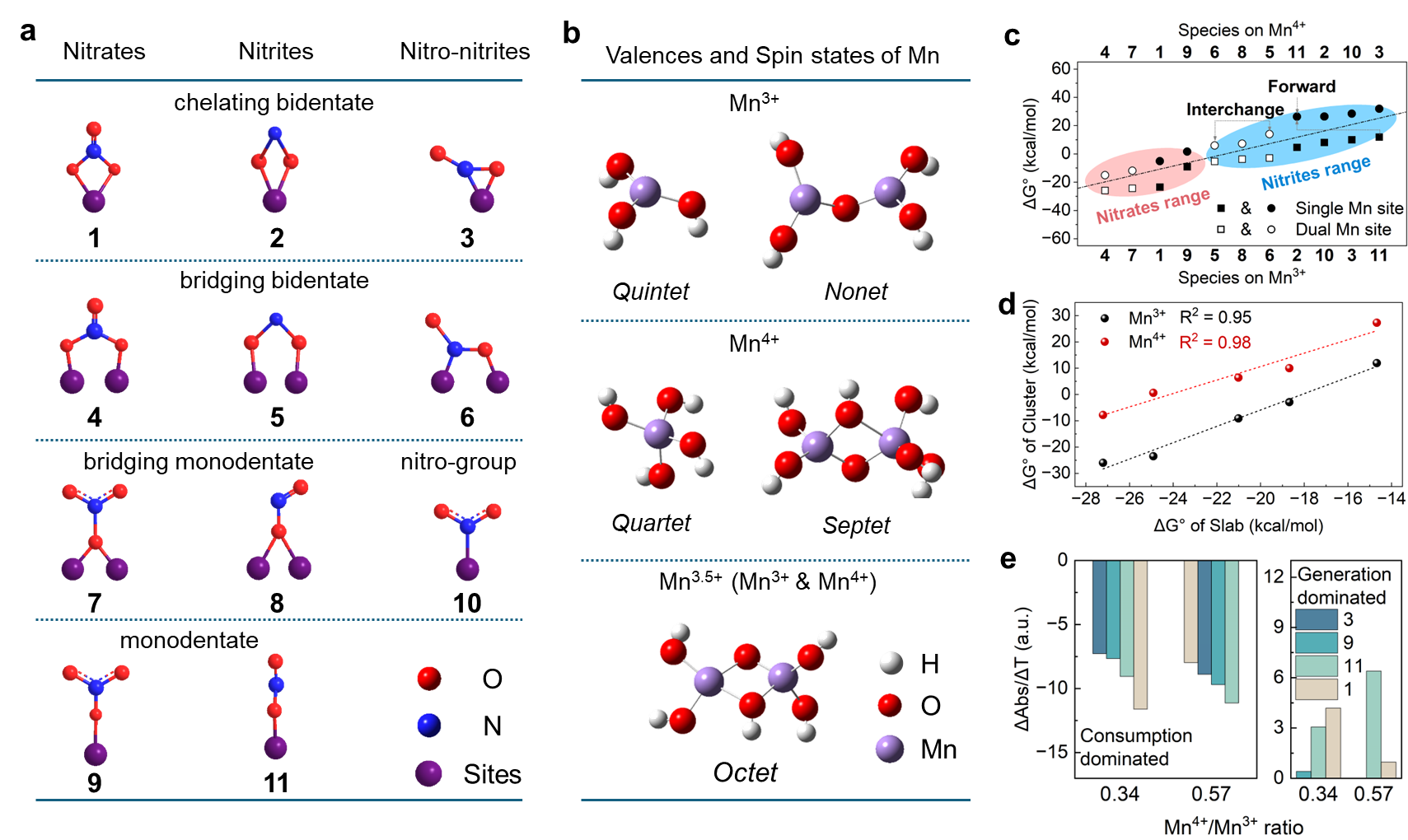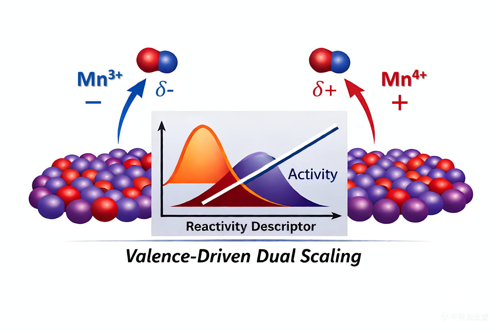 TOC Graphic 价态驱动的SCR中间体反应性的双标度规律 课题组李雪辉教授联合美国北卡罗来纳大学教堂山分校刘述斌教授、中国科学院过程工程研究所何宏艳研究员,在氮氧化物(NOx)选择性催化还原(SCR)这一关键环境催化领域取得重大理论突破。研究团队通过原位漫反射红外光谱(in situ DRIFTS)与密度泛函理论(DFT)计算,以锰基催化剂为模型,首次揭示了不同价态活性位点上NOx中间体反应性的“双标度”规律,并成功找到一个统一的电子描述符将其关联。这一发现为复杂SCR反应机理提供了首个定量统一的描述框架,对理性设计高性能催化剂具有重要指导意义。该成果已于近日在Journal of the American Chemical Society期刊发表。 一、研究背景——机理复杂,亟需统一认知 氮氧化物是危害极大的大气污染物,对环境和人类健康造成严重影响。在现有的治理策略中,以氨为还原剂的选择性催化还原技术被广泛应用于NOx的脱除。过渡金属基催化剂,特别是含Mn体系,因其丰富的氧化还原性质和高效的催化性能,成为SCR技术的核心。这些催化体系主要遵循Langmuir-Hinshelwood机理:NOx和NH3中间体吸附活化于催化剂表面,随后耦合生成N2和H2O。然而,NOx中间体的结构多样性(如螯合/桥式单齿/双齿硝酸盐/亚硝酸盐等,图1)与多种金属价态的共存(如Mn3+与Mn4+,图1),使得SCR的基元路径错综复杂,导致当前定性模型争议不断,缺乏预测性框架,严重制约了催化剂的定向设计与性能优化。即存在一个根本性科学问题悬而未决:是否存在一个统一的机理原则,能够解释Mn3+和Mn4+截然不同的电子结构如何调控NOx中间体的反应性?