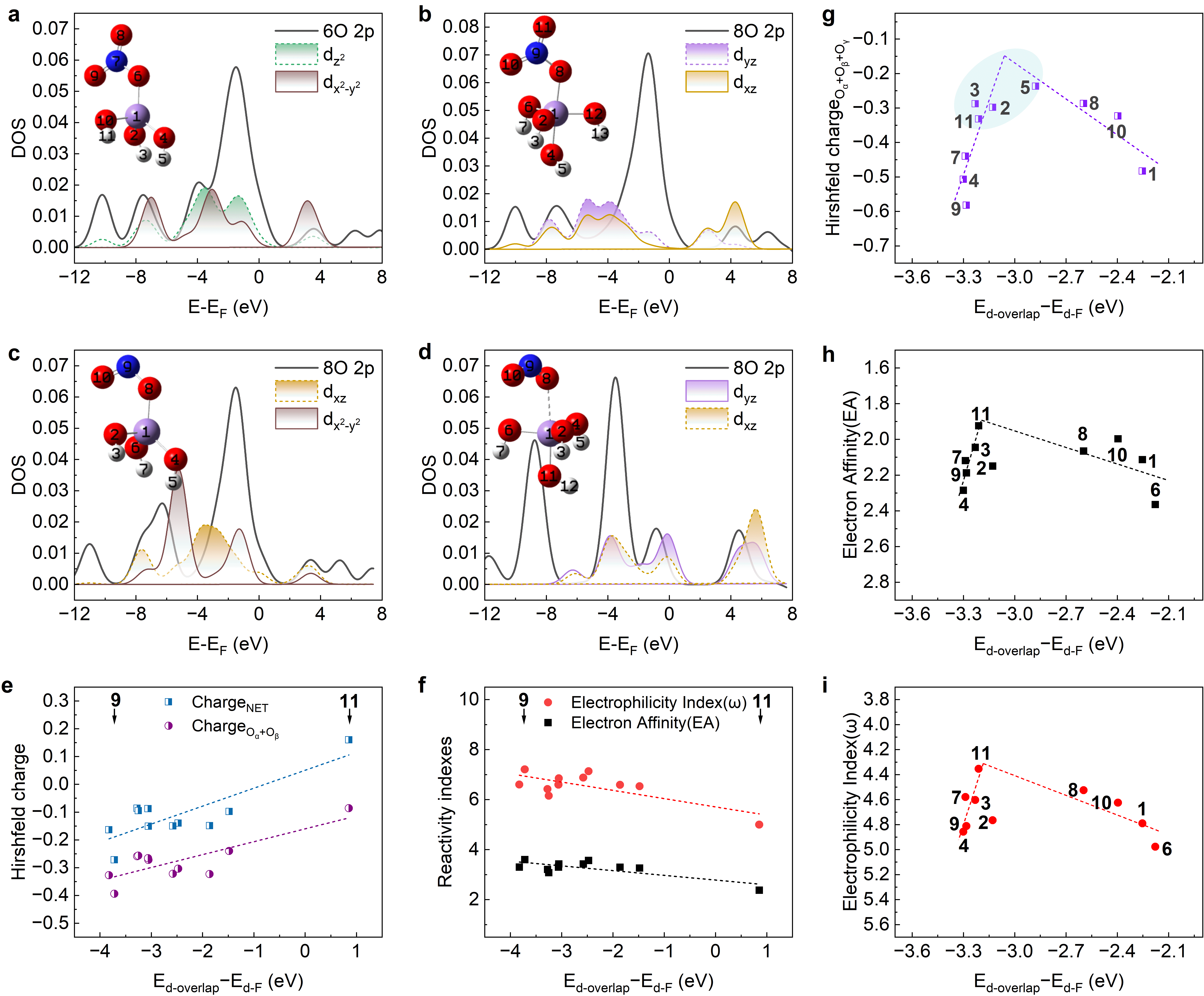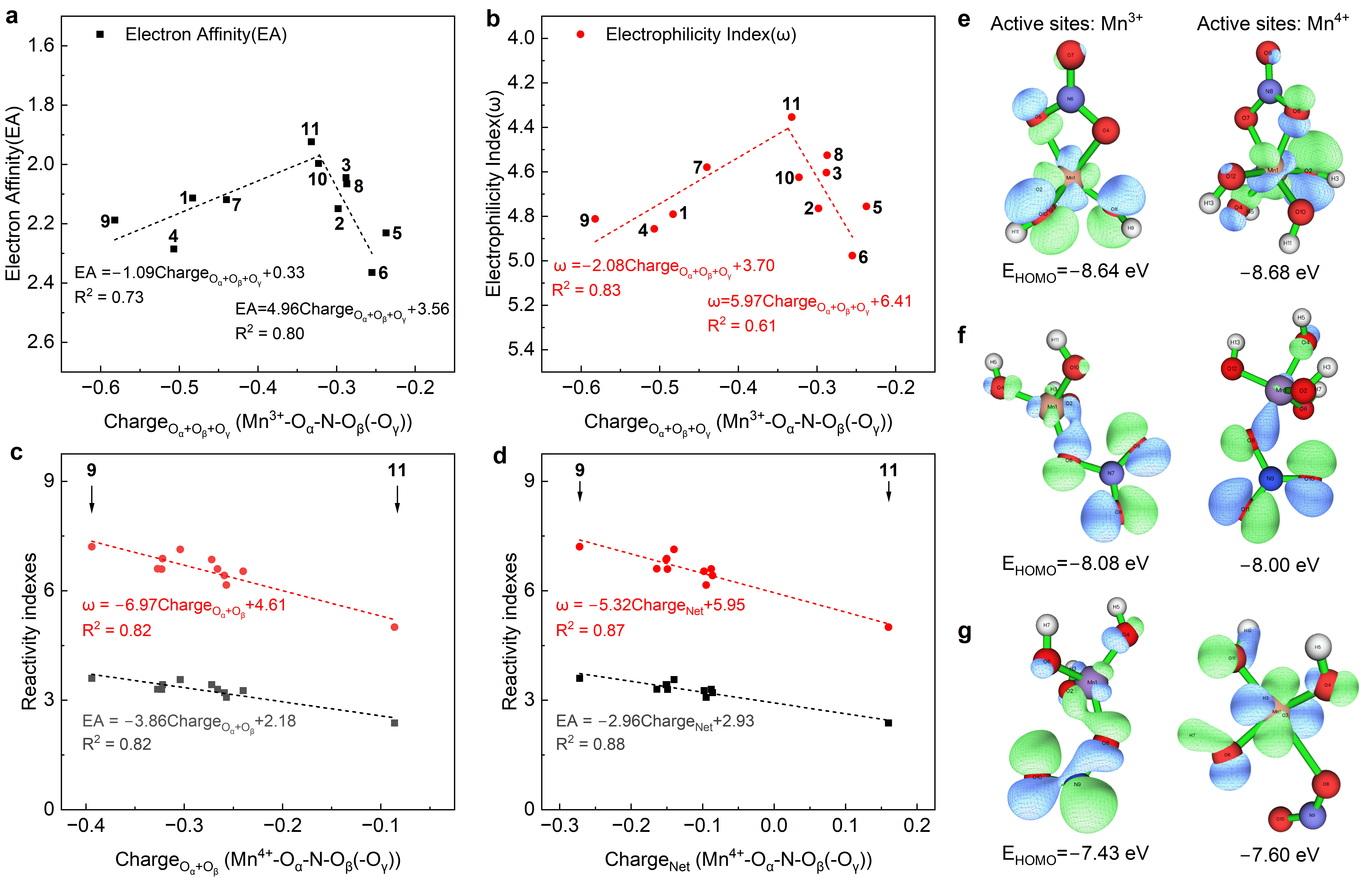 图3. Hirshfeld Charge对NOx中间体的双标度控制规律:Mn3+火山型vs Mn4+线性 二、核心突破——发现“双标度规律”与“统一描述符” 为解决上述挑战,团队开展了系统的实验与理论工作,并获得以下核心发现:(1) 模型验证 (图1),计算IR频率与in situ DRIFTS实验数据高度吻合、团簇模型与周期性结构模型吸附能线性相关,系统验证了27种Mn基NOx中间体(Mn-Oα-N-Oβ(Oγ))团簇模型的可靠性。(2) 价态驱动的Hirshfeld charge极性反转(图2),Mn3+ → Mn4+跃迁诱导电荷重分布,使单齿亚硝酸盐的反应氧位点从Oα切换到Oβ,其与NH3之间的氢转移过程的TS能垒从22.0 kcal/mol降至14.8 kcal/mol。(3) 双标度规律(图3),Mn3+位点上NOx中间体的反应性遵循Sabatier火山型趋势,Mn4+位点呈现线性标度关系,首次将SCR反应中的不同路径纳入统一的定量框架。(4) 统一电子描述符(图4),Ed−overlap−Ed−F (经费米能级校正的与NOx中间体O 2p轨道重叠最大的Mn 3d轨道能量)成功连接双标度规律,与配位场理论高度一致,同时捕捉到NOx吸附物种的动态相互作用。(5) 普适性潜力,Fe掺杂MnOx体系验证了机理特征的普适性(IR一致性、电荷反转、CDFT趋势、双标度规律),表明多价态是过渡金属催化剂的普遍特征,本工作发现的双标度规律有望为更广泛的催化剂体系提供统一框架。 三、重要意义与普适性前景 本研究发现的双标度规律不仅为理解Mn基SCR催化剂中价态依赖的反应路径提供了原子级见解,捕捉到了NOx吸附物种的动态相互作用,证明了过渡金属3d轨道的对称性和排布同时决定了电荷分布和化学反应性。更重要的是,建立了基于电子结构工程的催化剂设计预测框架。并由于多价态是过渡金属催化剂的普遍特征,这一框架有望推广至其他多价态过渡金属催化剂体系(如Fe、Co、Ni、Cu等),为开发新一代高效NOx脱除催化剂提供理论指导,为基于电子结构工程的催化剂设计开辟了新路径。