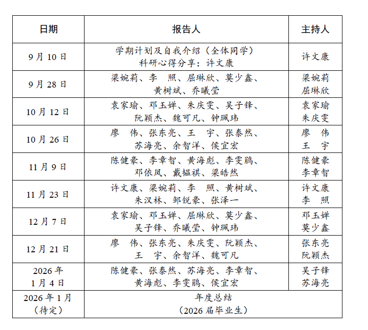 注: 1. 从第二次组会开始,组会时间为下午6:00,地点为工程馆四楼会议室,如有改动另行通知。学期内,课题组全体成员(包括强基、拔尖班本科生)均需参加。组会开始前在学习通扫码签到,若无故缺席,课题组将提出严厉批评。 2. 主持人:开启线上会议室(如有需要),负责督促该次学术活动的报告人准备报告,提醒实验室成员活动时间,通知可能发生的特殊情况,布置会场,主持会议,发起讨论,作会议记录,会后将报告汇总发给老师。 |