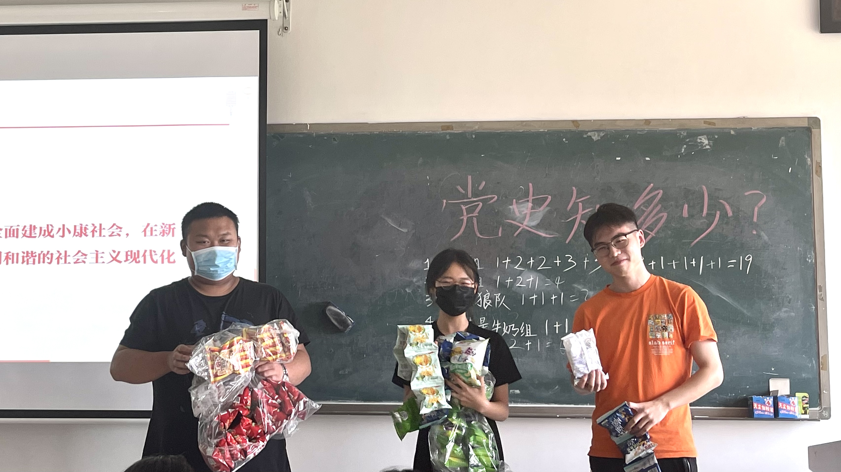 知识竞赛采用提问和抢答的方式进行,团支书使用多媒体展示相关党史知识和问题,现场同学举手抢答,先到先得。题目内容包含中国共产党百年历史的光辉时刻,并通过图文、视频、音频等多种类型体现,增强了活动趣味性。一道题目答完,团支书还对相关题目的背景知识进行详细讲解,加深同学们对题目背后党史知识的了解。通过激烈的比拼,最终决出一、二、三等奖。活动现场气氛高昂,同学们激情澎湃、参与度高、学习积极性强。