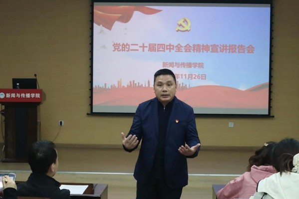 文章来源:新闻与传播学院浏览次数:13为了深入学习贯彻党的二十届四中全会精神,深刻理解全会擘画的发展蓝图,切实凝聚共识,11月26日,新闻与传播学院在B9南座301召开党的二十届四中全会精神宣讲报告会。华南理工大学学习宣传贯彻党的二十届四中全会精神宣讲骨干、我院2022级本科生玉米提江·阿力木担任宣讲嘉宾,学院党委书记谭志伟、党委副书记刘涛、研究生辅导员高惠君及近80名学生党员参会,会议由刘涛主持。