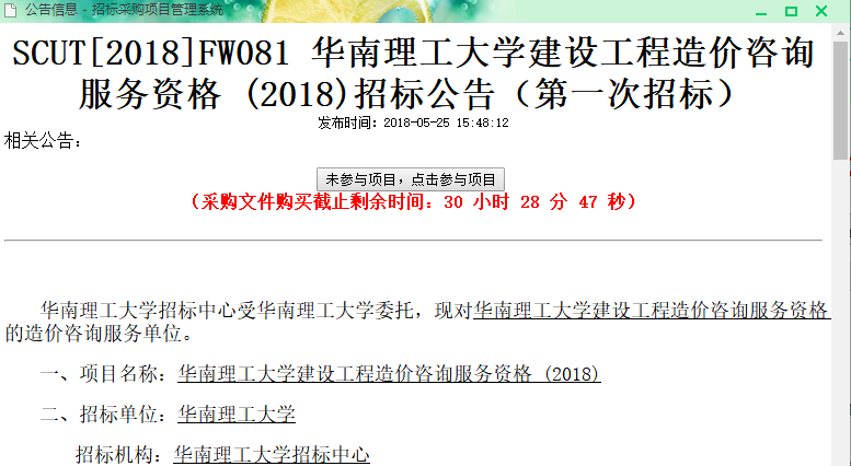 九、工程造价咨询服务招标相关准备工作已完成,招标申请书、招标需求、招标文件已送招标中心,历经多次沟通该项目已正式挂网,投标报名时间:2018年05月25日—2018年06月01日,开标时间:2018年06月15日09时00分。
