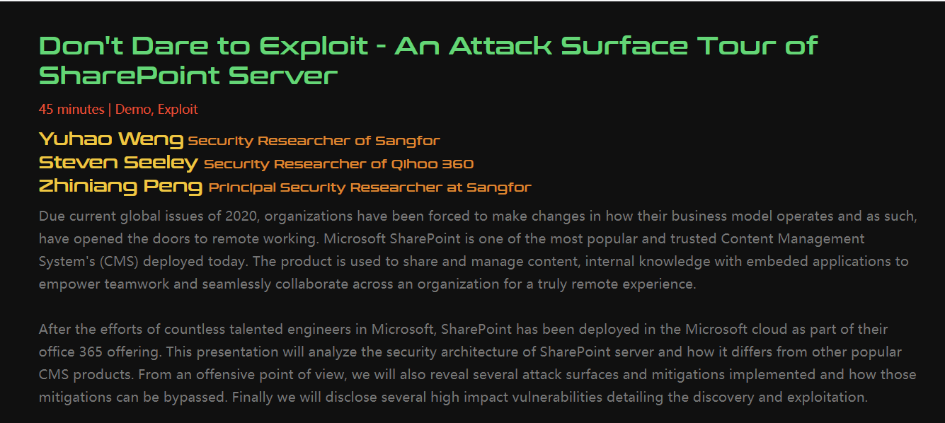 来自Kap0k战队、信息安全专业大四学生翁煜浩,目前是深信服安全蓝军的实习研究员,在过去一年中,他致力于Web安全研究,研究课题: Don't Dare to Exploit - An Attack Surface Tour of SharePoint Server, 已被Defcon 29 录用,将于今年8月进行会议演讲和发表。