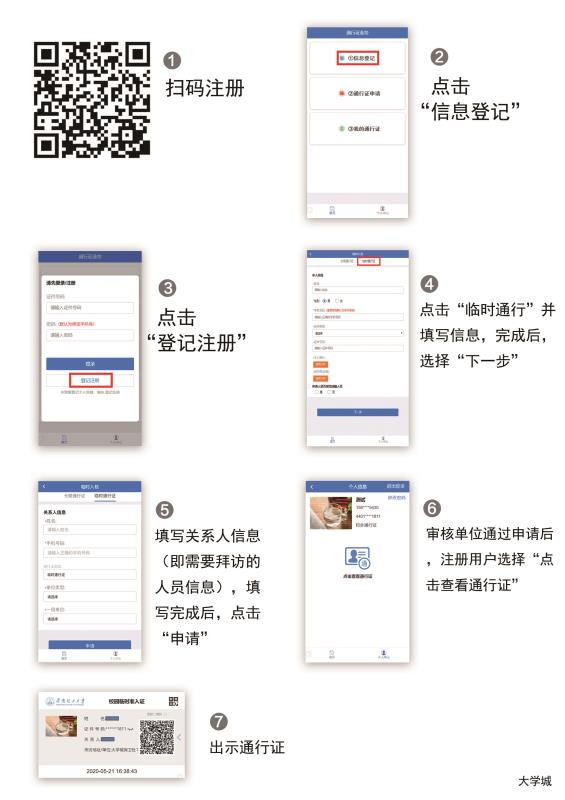 来访人员需扫描下图二维码填写申请相关信息,由各二级单位审批后生成电子通行证。若来访人员需要开车进校,可在填写申请时的“访问事由”一栏增加其车牌信息,最终出示通行证即可。
