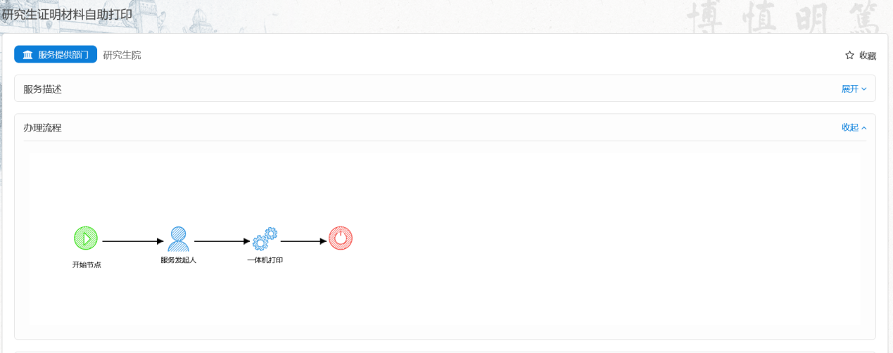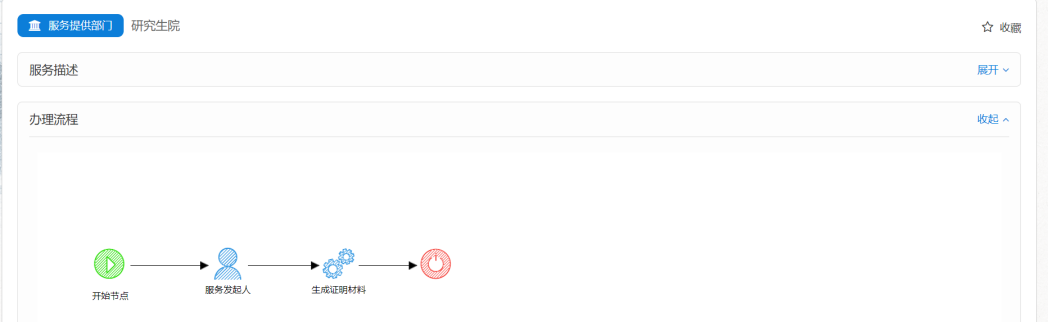 点击【展开】可查看办理流程。由服务发起人在服务中的申请表单发起申请后,待后台生成材料在办事大厅进行导出。
