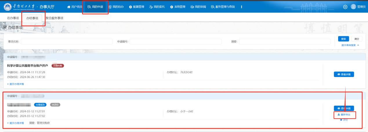 若已完成,请在办事大厅导出,路径为:办事大厅→我的申请→办结事项→本次申请的事项→导出or重新导出。