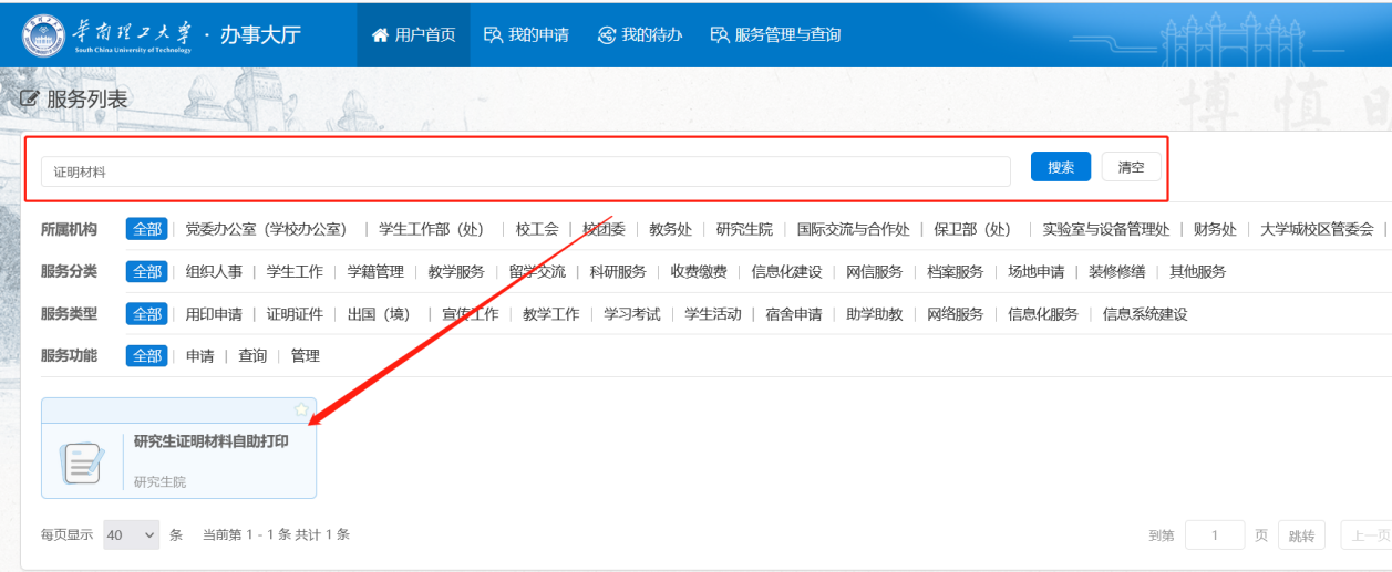 或者在搜索框查找“证明材料”服务,选择对应服务: