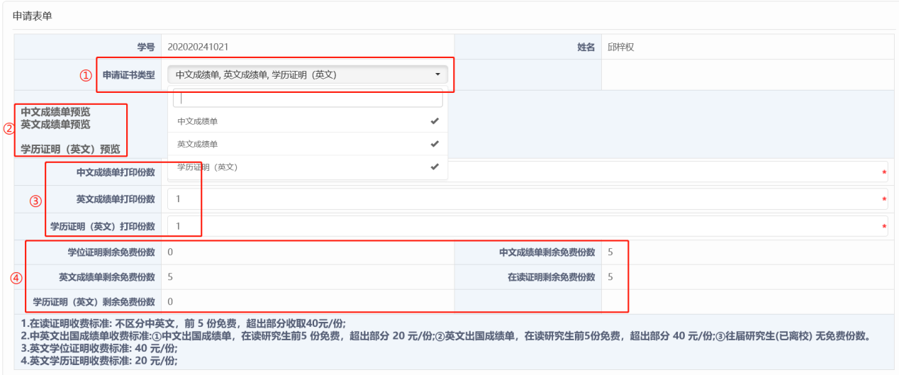 申请证书类型:点击可出现能够申请打印的证书类型,可进行多选