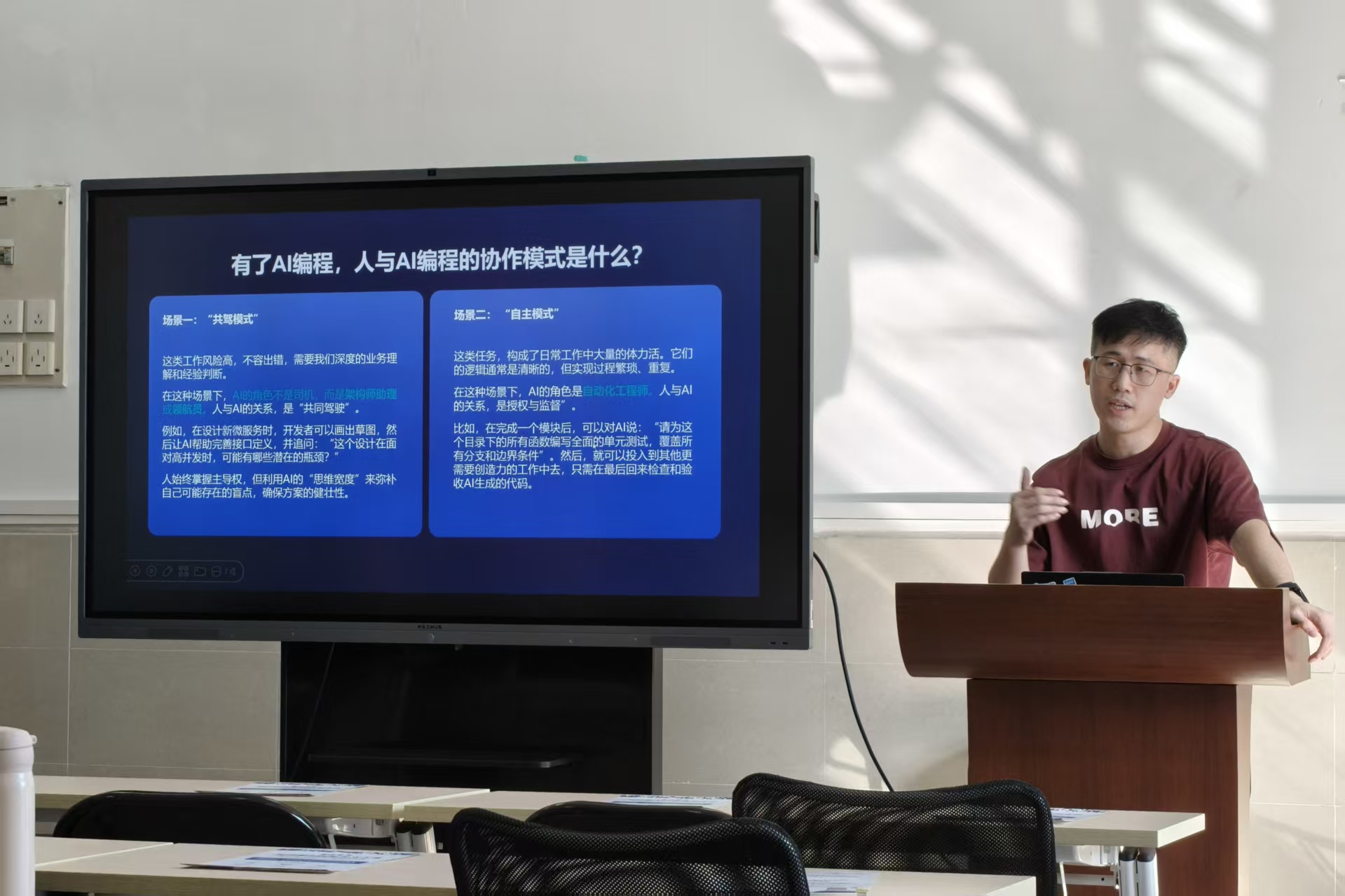 讲座上,深信服CoStrict架构师陈烜先生阐述了他对人与AI编程的协作模式的独到见解,重点介绍了人在AI编程中的独特价值,分享了自己与AI协作的几点心得,同学们受益匪浅。