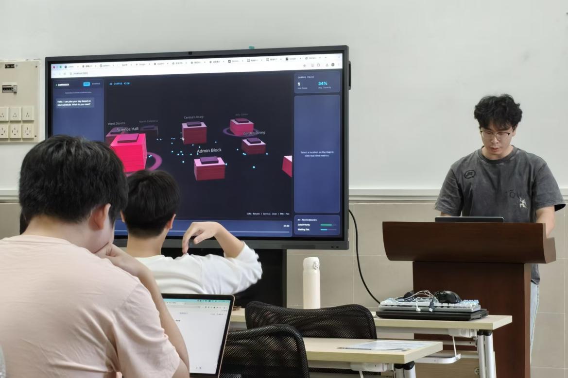 随后,她给出了本次讲座现场AI Coding挑战的题目。同学们拿到题目纷纷开始编写程序,在规定时间内陆续完成编程。获奖学生现场展示作品,分享应用思路以及CoStrict使用体验,与主讲人深入交流。