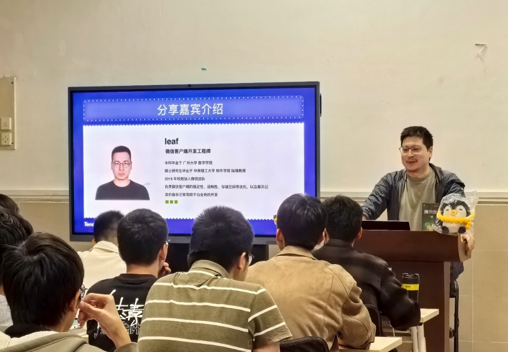 最后,作为本科毕业于广州大学数学学院、硕士研究生毕业于华南理工大学软件学院的学长,Leaf结合自身经历,讲述了 2018 年通过校招加入微信团队后的成长历程。他分享了从基础业务入手,在跨平台开发、性能优化等工作中积累经验、突破自我的过程,并针对行业趋势给出建议,强调扎实的编程基础、跨平台开发能力与持续学习意识的重要性,鼓励学子注重理论与实践结合,为职场发展筑牢根基。