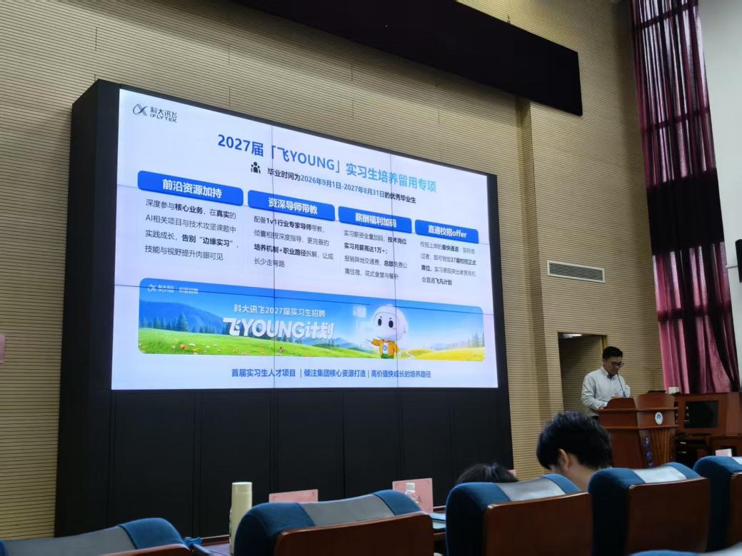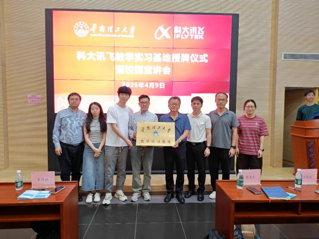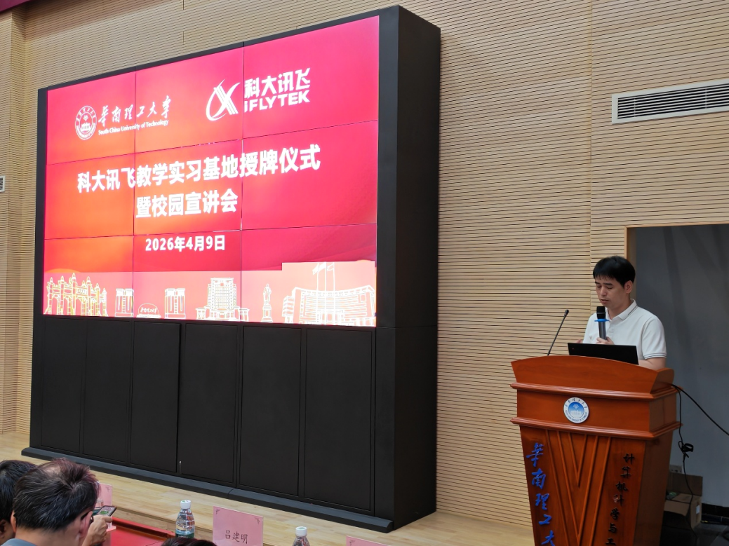2026年4月9日下午2时,华南理工大学计算机科学与工程学院与科大讯飞股份有限公司联合举办的科大讯飞教学实习基地授牌仪式暨校园宣讲会在大学城校区B3-213报告厅顺利举行。