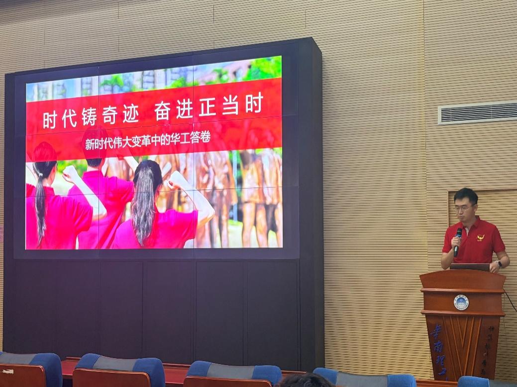 宣讲环节中,“习语心传”学生党员宣讲团成员王玮以“新时代伟大变革:时代铸奇迹,奋进正当时——新时代伟大变革中的华工答卷”为主题作宣讲。宣讲立足新时代经济快速发展和社会长期稳定“两大奇迹”,深刻阐释我国在科技创新、产业升级、社会公平、乡村振兴等领域面临的时代课题,并结合我校学子研发法律智能系统、师生团队服务乡村振兴等鲜活案例,生动展现华工人立足本职、科创报国、服务社会的实干精神,引导青年学子自觉将个人理想追求融入国家和民族事业发展大局。