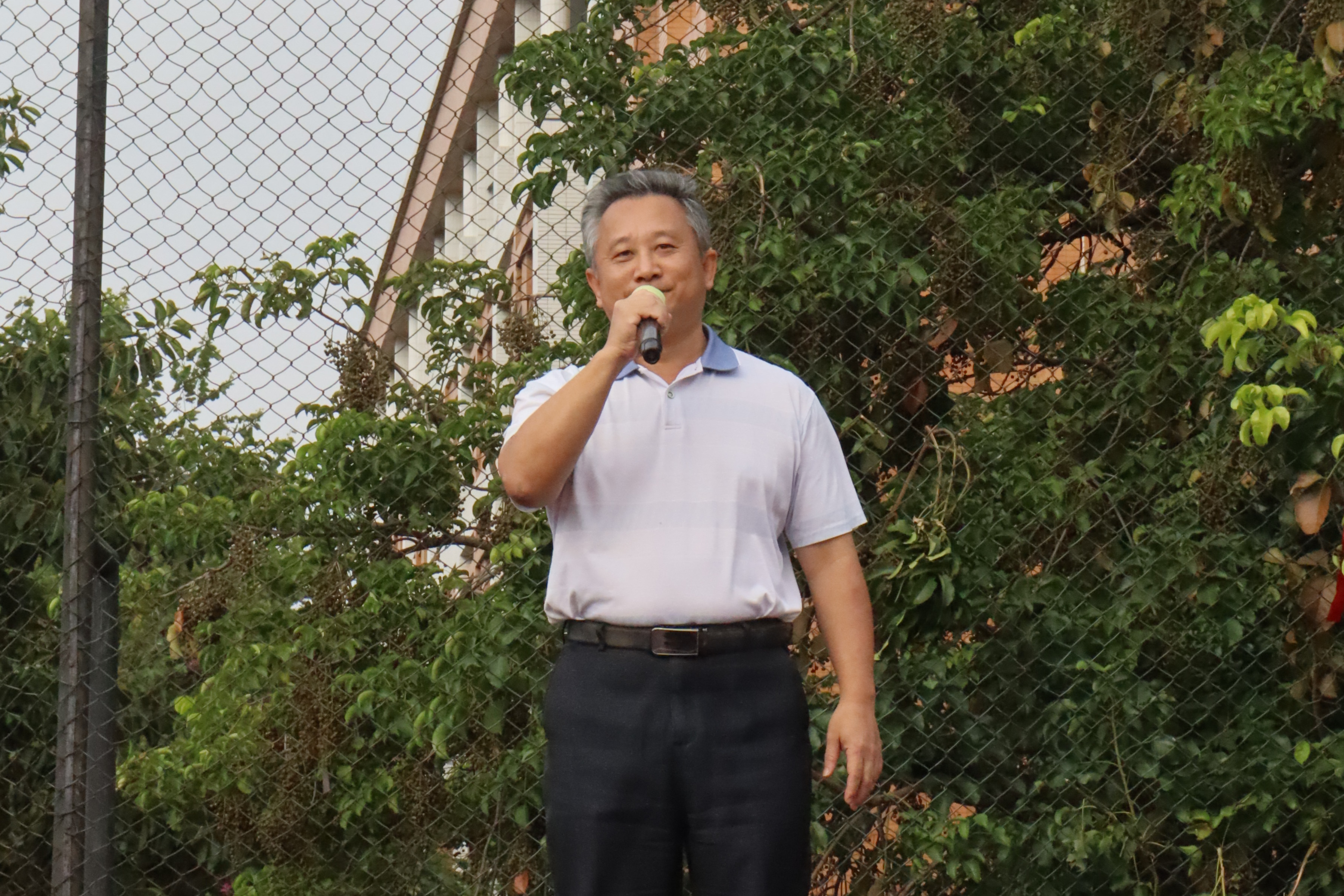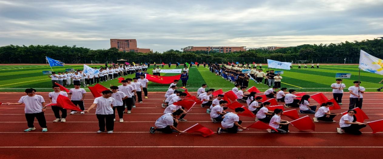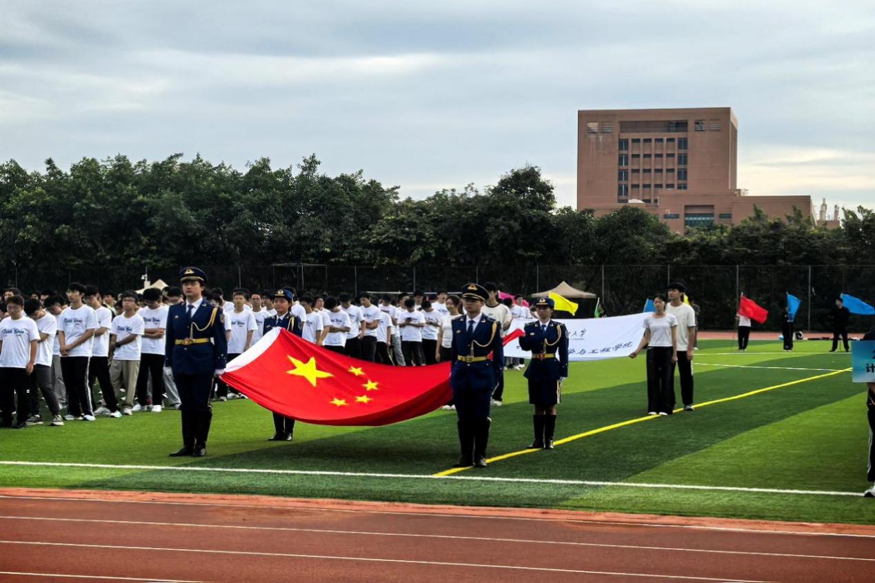 在所有班级入场站定之后,全体师生起立奏唱中华人民共和国国歌。唱完国歌后,学院党委副书记陈浩文发表致辞,他在致辞中强调了“健康的体魄是奋斗的基石,拼搏的精神是成长的底色”,更呼吁我们“在人生的赛道上持续奔跑,在成长的征程中不断超越”。