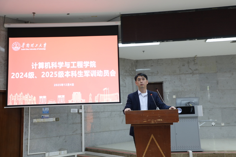 为深入贯彻新时代军事教育方针,落实立德树人根本任务,强化学生国防观念与纪律意识,12月4日下午,华南理工大学计算机科学与工程学院在大学城校区A4-104召开2024级、2025级本科生军训动员大会。学院党委副书记陈浩文老师、辅导员李希老师、马瑞羚老师出席会议并作动员讲话,全体参训学生参与本次大会。