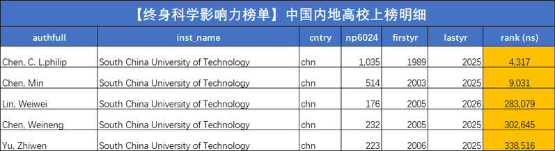 Among them, Chen Junlong, Chen Min, Lin Weiwei, Chen Weineng, and Yu Zhiwen were additionally named to the Career-long Scientific Impact list.