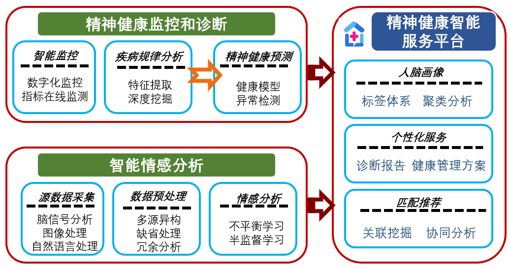 In the demonstration application of emotional and mental health, the research focuses on exploring a new model integrating brain science and AI, and constructing an intelligent platform that integrates diagnosis, monitoring, and services. Multi-modal sensors are used to collect brain signals, behavioral, and emotional data; combined with deep-wide neural networks and classification models, early identification of mental illnesses is achieved, reducing subjective errors in diagnosis. At the intelligent monitoring level, the key task is to develop disease risk prediction and trend analysis models, using deep learning methods to explore potential etiologies and early symptoms, and establishing a hierarchical health assessment and early warning system. At the service level, the research will construct a mental health service platform through brain disease correlation mining and personalized recommendation algorithms, providing diagnostic assistance for doctors and generating personalized reports and management plans for users, thereby promoting the transformation of mental health services from passive treatment to proactive intervention. Its significance lies in providing new tools for the early diagnosis and treatment of mental illnesses and improving the overall mental health level of society.