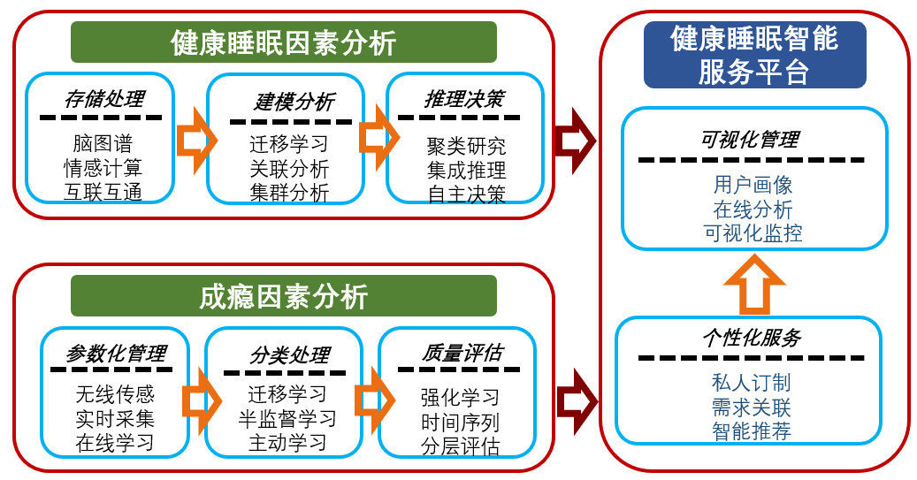 In the demonstration application of addiction and healthy sleep, the research goal is to establish an intelligent sleep health and brain science service system. By collecting and fusing multi-modal data (such as brain waves, brain imaging, behavior, and environment), the key factors affecting sleep quality are analyzed, and a healthy sleep factor correlation model is established using graph neural networks and deep-wide learning algorithms. At the intelligent monitoring level, the research will collect and analyze sleep data in real time, constructing a precise sleep state classification and hierarchical assessment system. At the intelligent service level, through personalized sleep profiles and visual monitoring platforms, users will be provided with scientific sleep improvement suggestions. Meanwhile, for drug addicts, the research will combine transfer learning and semi-supervised learning algorithms to establish an intelligent assessment model for addiction status, providing support for risk monitoring during drug detoxification and relapse prevention. The significance of this direction not only lies in improving the overall sleep health level of the public but also in providing scientific means for drug detoxification and rehabilitation, contributing to public safety and social governance.