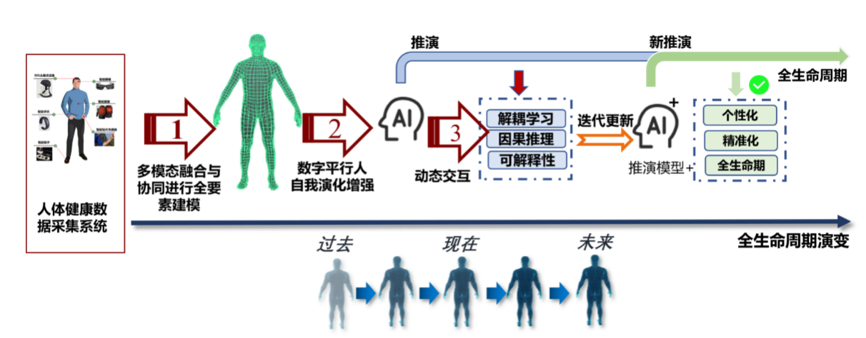 A health data collection system incorporating multiple types of sensors (including contact and implantable sensors) will be developed to break down information silos and achieve interconnection and intercommunication of multi-source heterogeneous data such as physiological data, medical history, and medication history. On this basis, a high-fidelity virtual model with multi-dimensional and multi-spatiotemporal scales will be built to ensure real-time consistency between the digital parallel human and the actual human body. Through machine learning, deep anomaly detection, and visual analysis, the correlations and causal relationships between various factors and diseases will be explored, and an interpretable knowledge base will be formed. This enables the rapid capture and feedback of easily overlooked early physiological signals of diseases, thereby advancing the precision of disease prediction, prognosis analysis, and health intervention.