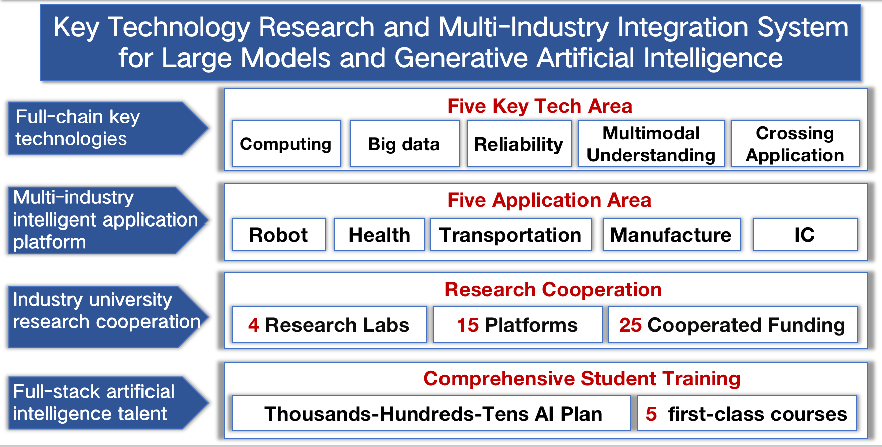 In the center's development, the guiding principle is to build a "research system for key technologies in large models and generative AI coupled with a multi-industry integration system." Its construction is organized around four key areas: "full-chain key technology development, multi-industry intelligent applications, industry-academia-research collaboration, and full-stack talent cultivation." The center strategically focuses on five core pillars: "massive computing power, big data, robust security, advanced algorithms, and multidisciplinary cross-application." This approach aims to enhance the technical capabilities of large models in computational efficiency, decision-making accuracy, and secure application. By integrating technological breakthroughs, platform applications, industry-academia-research collaboration, and talent development, the center seeks to deeply merge key technologies with advantageous industries, thereby accelerating the application and implementation of these technologies across various sectors in the Greater Bay Area .