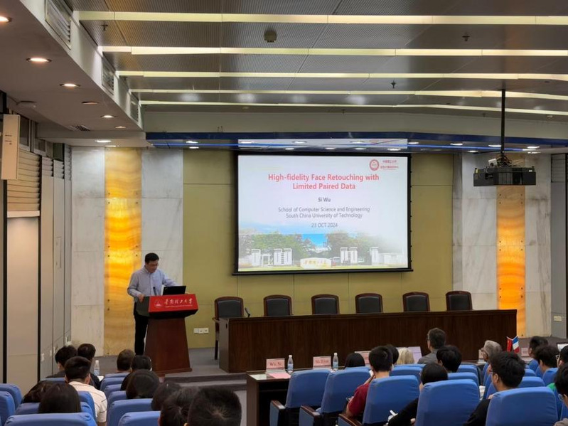 At the conference, Professor Wu Si from the School of Computer Science and Engineering of our university delivered a speech entitled High-fidelity face retouching with limited paired data. He introduced his latest research achievements in the field of artificial intelligence, proposing a language-guided defect removal transformer model that can effectively reduce the reliance of automatic face restoration on paired training samples, while improving the accuracy of defect detection and the quality of image synthesis.