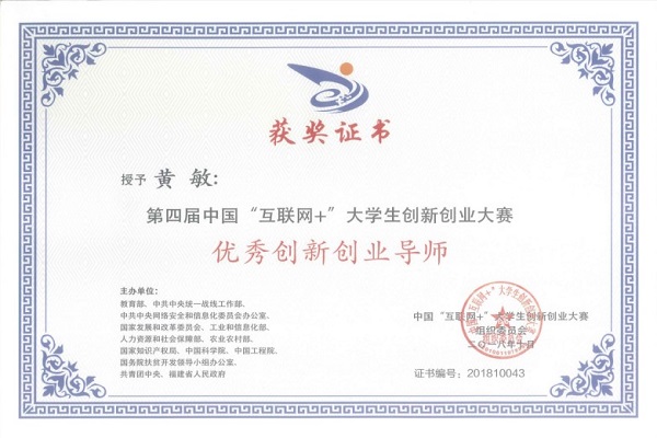 黄敏荣获第四届“互联网+”中国大学生创新创业大赛优秀创新创业导师