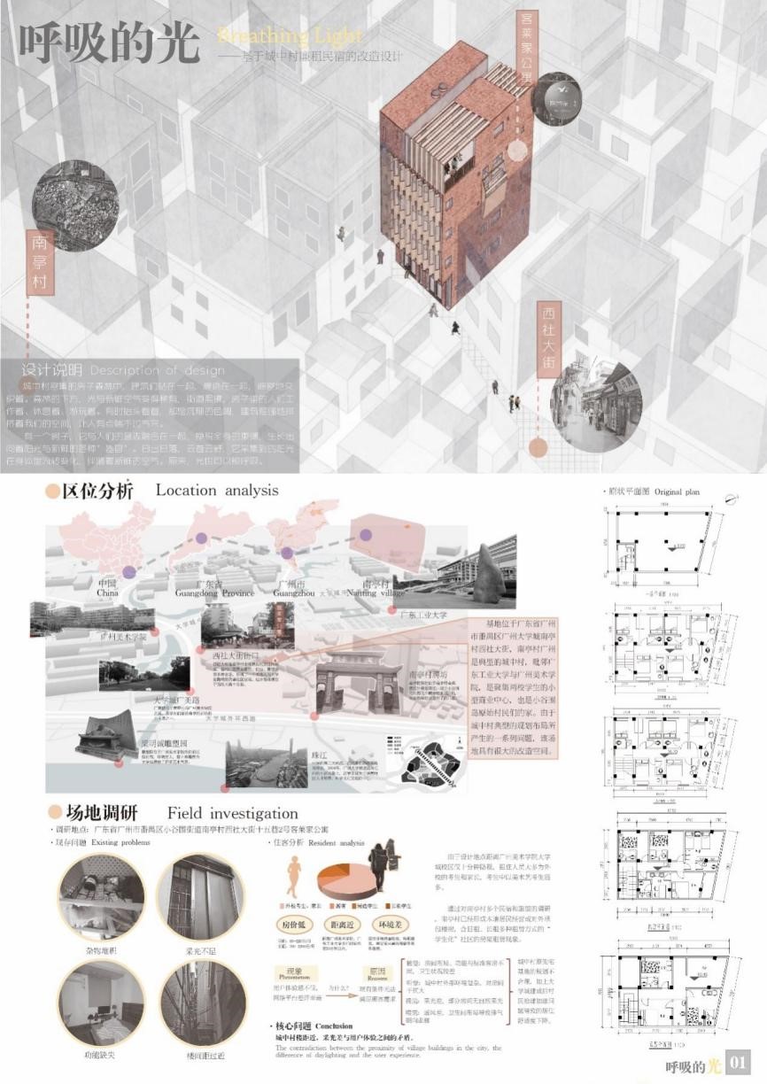 作为小谷围岛改造为大学城时当地居民力争保留所仅剩的几个城中村之一,南亭村具有广州城中村的典型的拥挤特征,为了抢占空间,这里四处都是楼间距不足50厘米的握手楼,我们所改造的公寓就是其一。这里的旅店基本由本地的一房东出租,二房东经营,住客多为周边学校的考生和家长,以学生身份实际入住体验了我们所改造的公寓,更方便地在各个时间段观察到旅店的问题,在这身临其境的体验下,感受到了狭窄又潮湿的空间的排挤、阳光的吝啬、喧闹的偏爱。因此,将阳光导入室内,让建筑能够如同我们一样“呼吸”便形成了我们的设计理念。