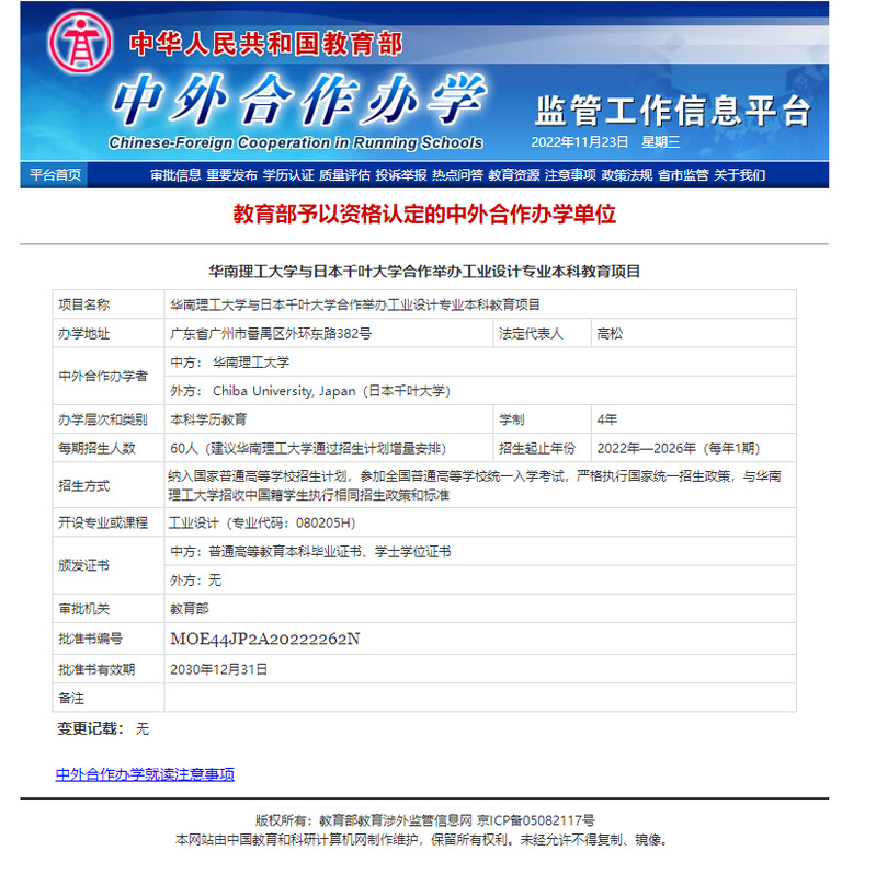 华南理工大学与日本千叶大学合作举办工业设计专业本科教育项目,是教育部予以资格认定的中外合作办学项目,是粤港澳大湾区首个中日合作办学项目。通过引进外方优质的设计教育资源,完善创新创业型、国际化专业人才培养体系,促进国际化人才培养,为推进国家尤其是粤港澳大湾区教育对外开放、推动我国工业设计发展提供人才和智力支撑。
